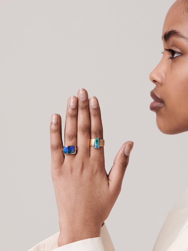full spectrum of iridescent colours and make for unique and eye-catching jewellery pieces. From ELHANATI’s intricate and magical creations to WWAKE’s unexpected arrangements and modern silhouettes, opals not only have a strong and mythical history, but their endless expressions also make them perfect for some of today’s most cult and avant-garde jewellery.
