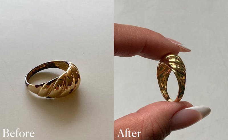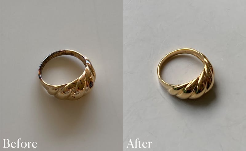 Below you will see some before and after images of the Mejuri croissant ring, replated by Finematter with 3 microns of 18k gold.
