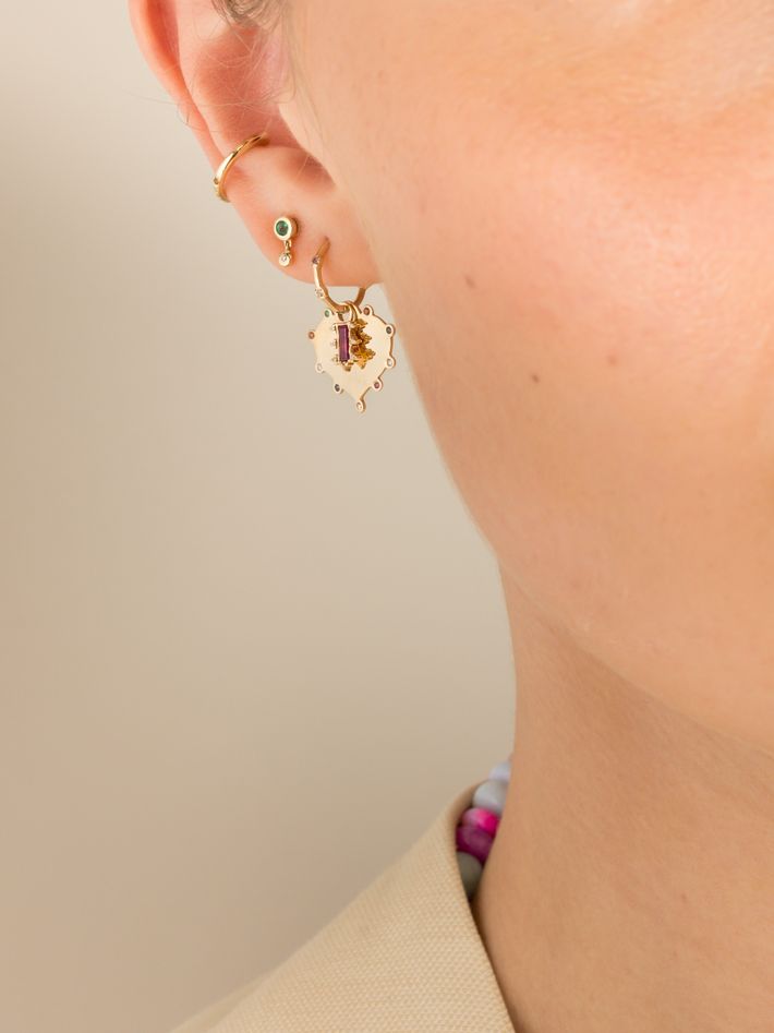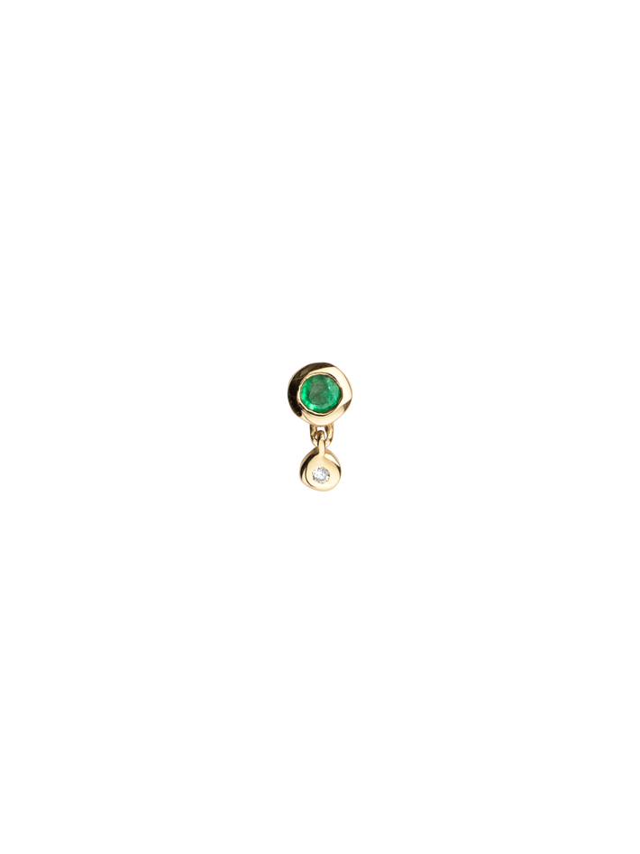 A subtle drop earring set with emerald and a diamond charm, great when stacked with a huggie and ear cuff.