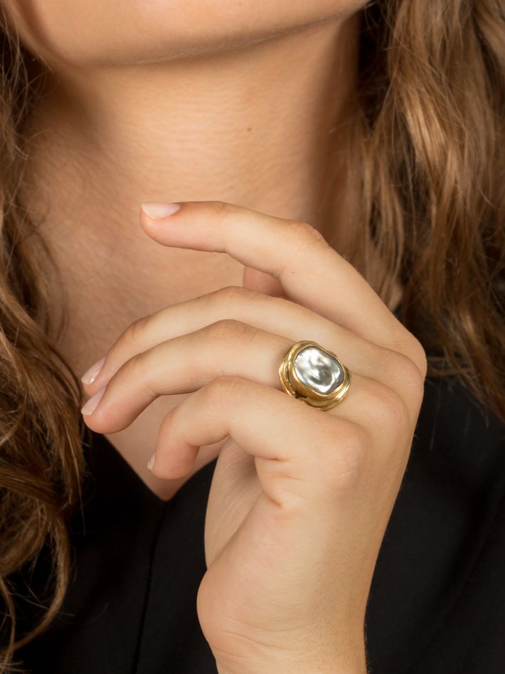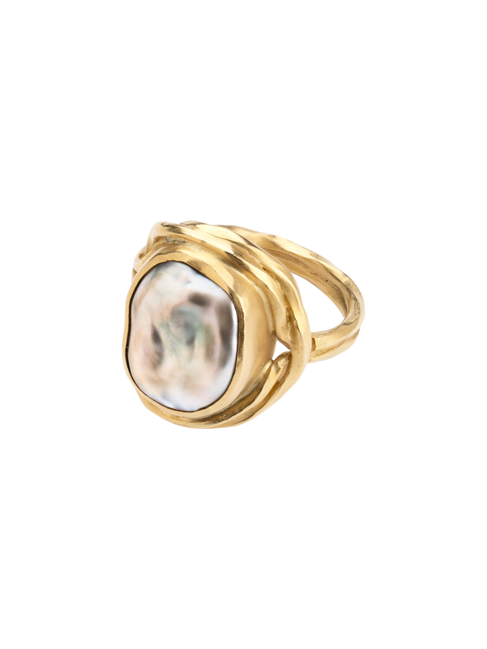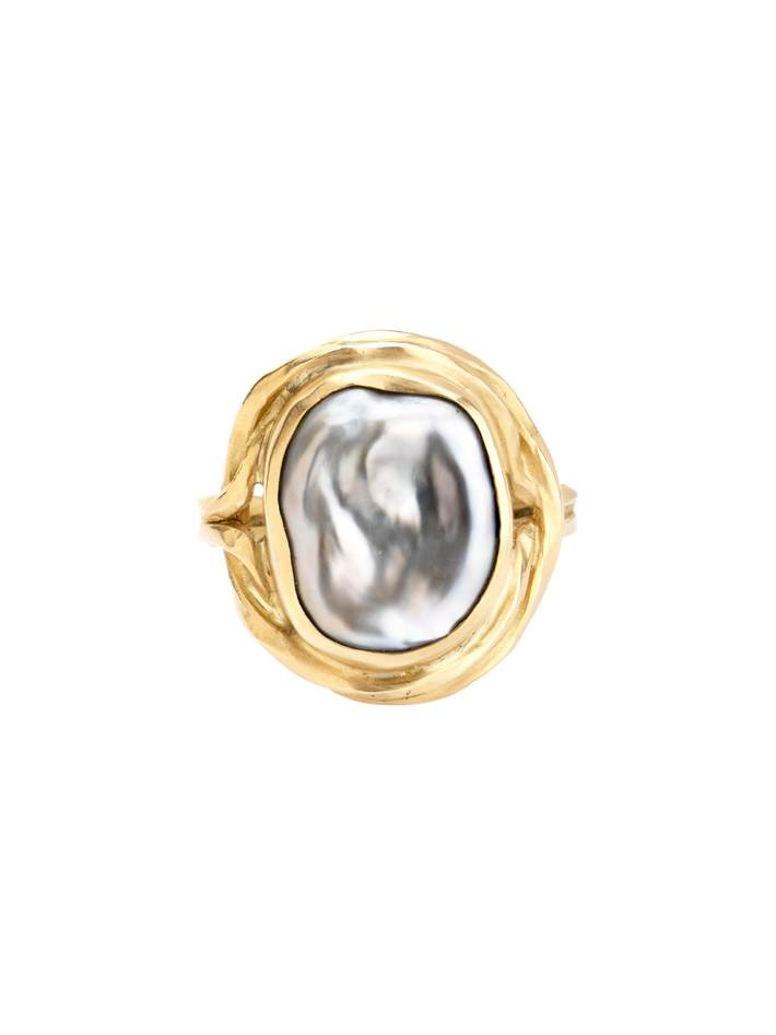 A flat grey pearl as the face of the ring.