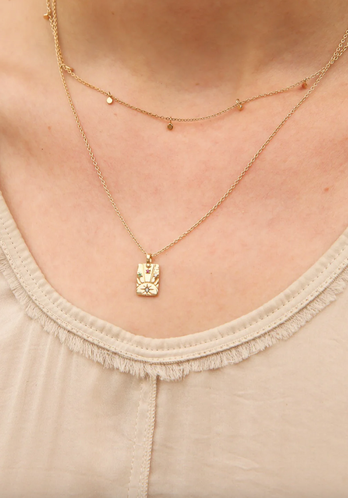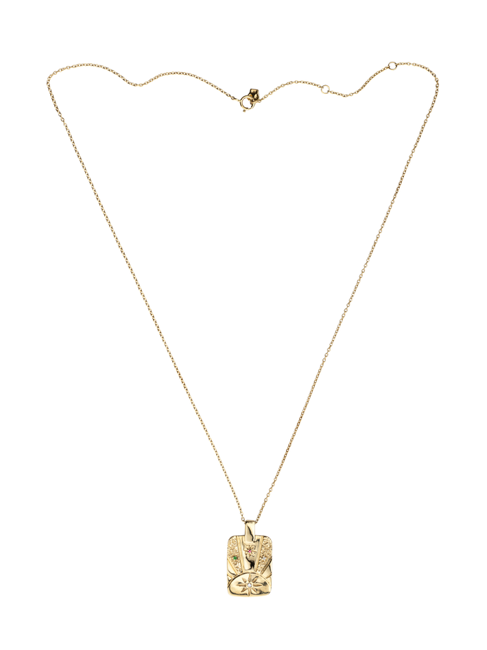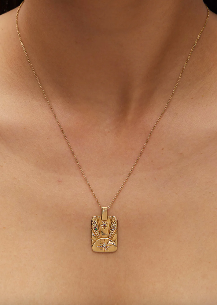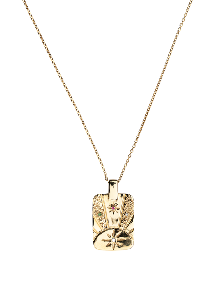 A talismanic tag necklace set with gemstones for a flash of colour, perfect for layering with different necklace lengths.
