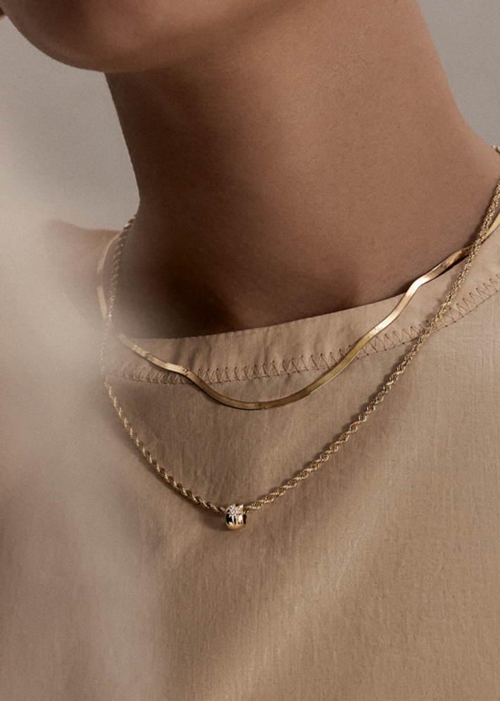 A precious and highly durable metal which comes in different golden hues depending on its purity.