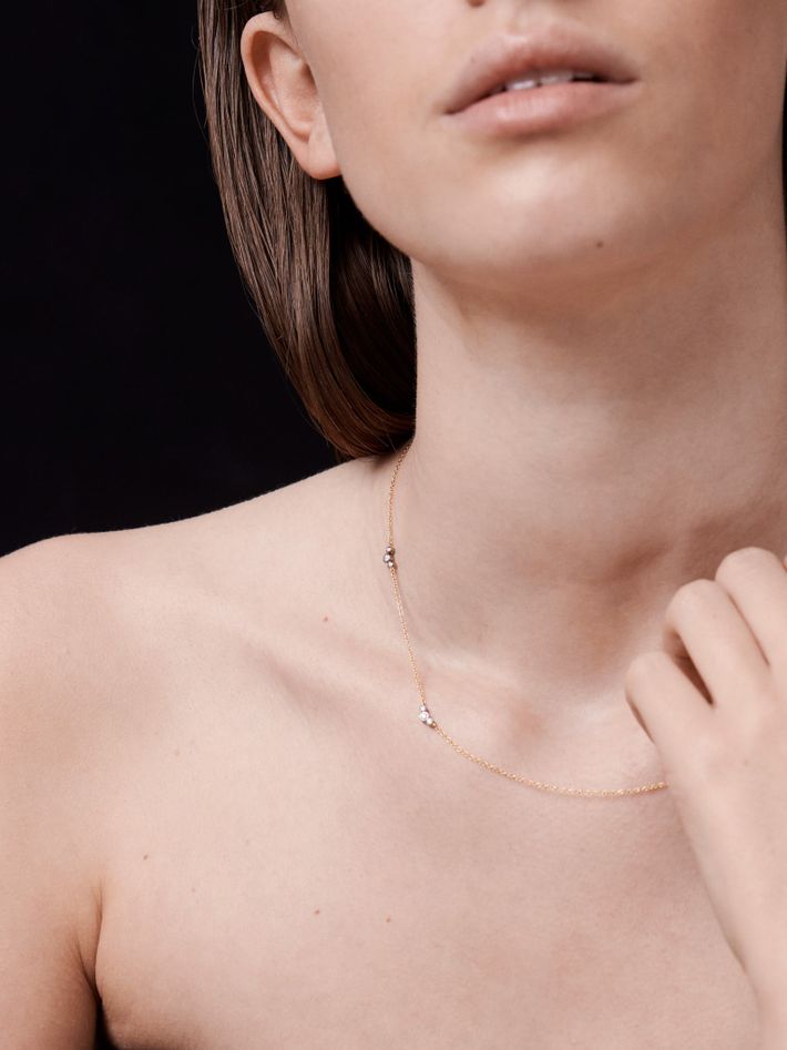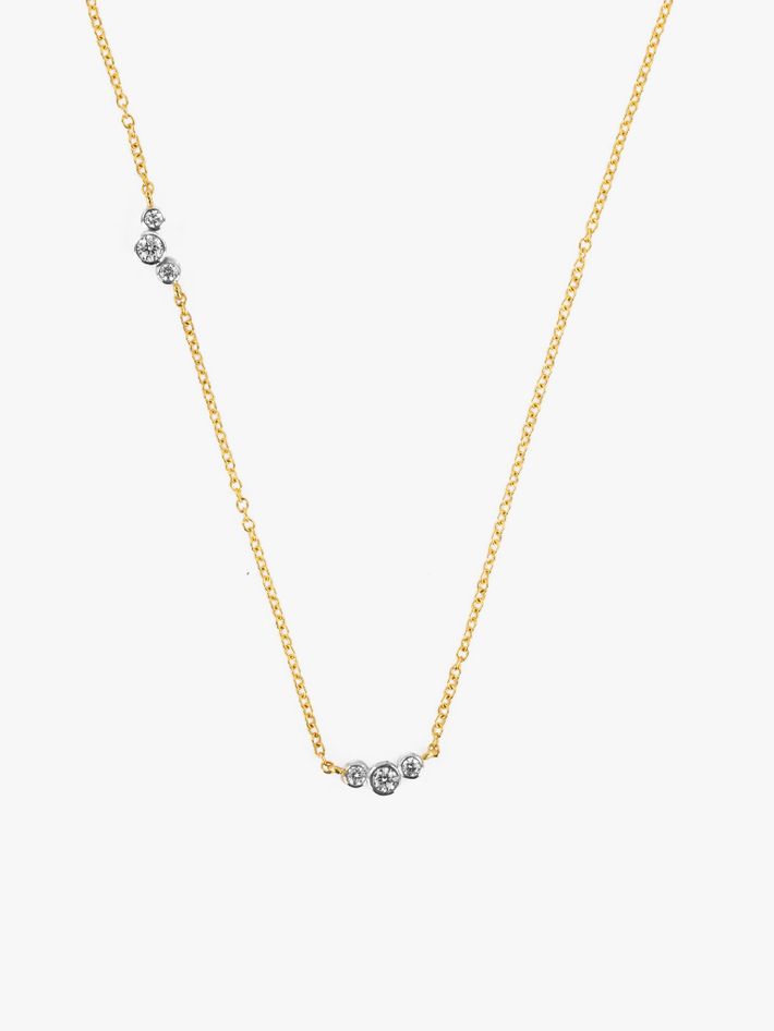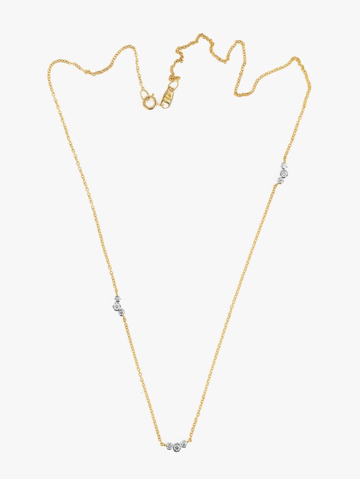 9 diamonds, totalling 0.18 ct, set into white gold on a yellow gold trace chain.