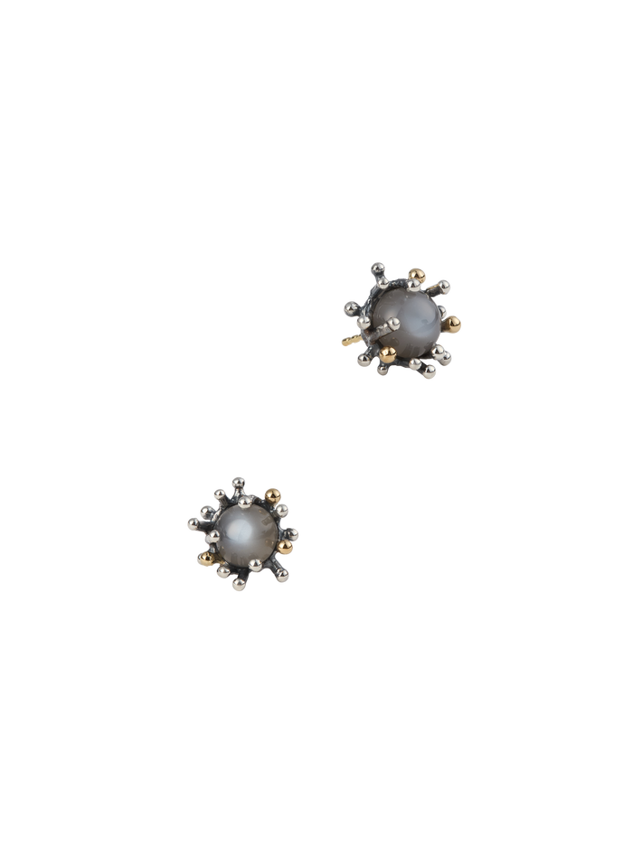 Sea anemone earrings in oxidized silver and 18k yellow gold with gray moonstone