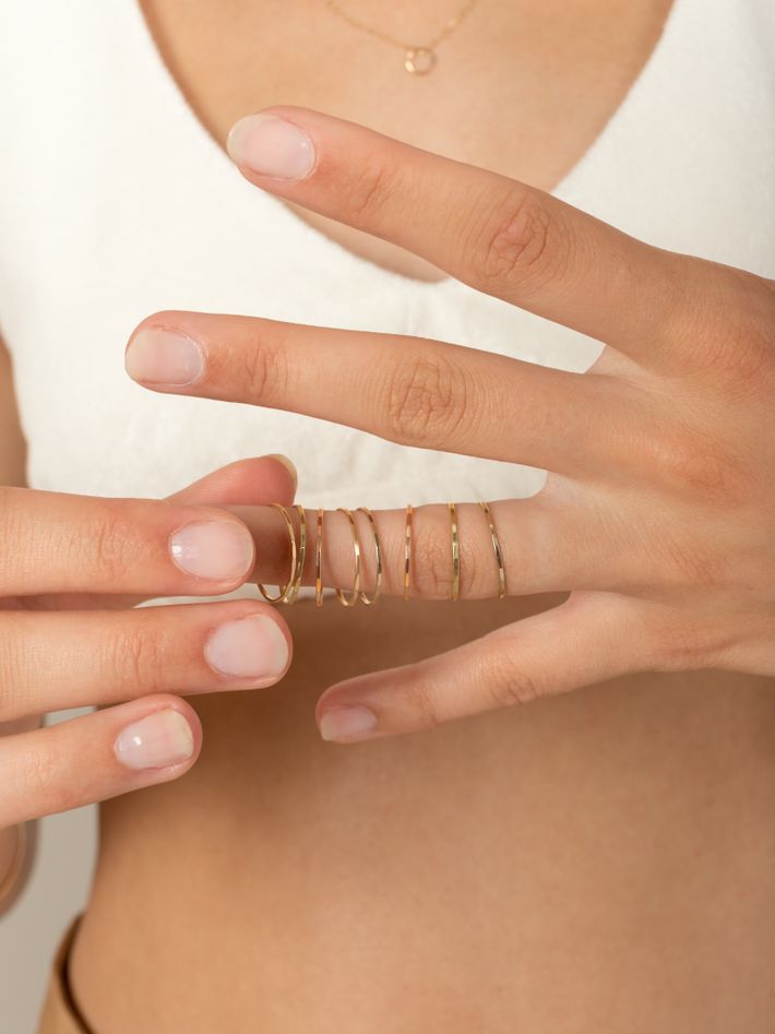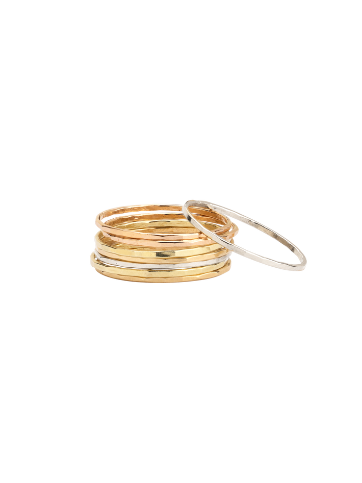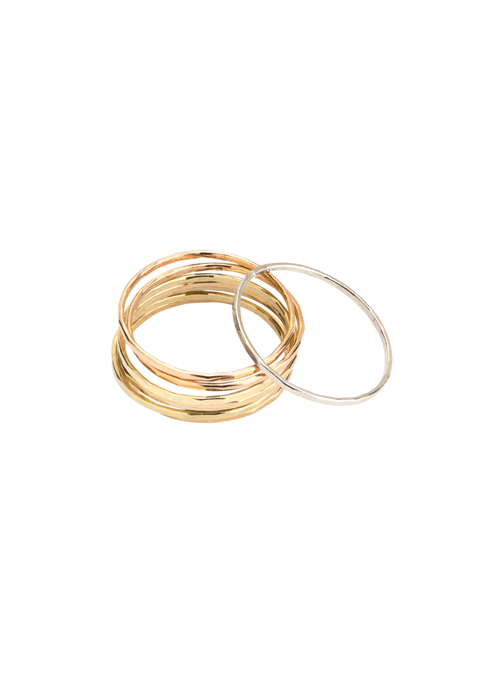 Featuring a rainbow of gold types, this ring stack brings a gradient of warmth along the finger. Each ring can also be worn as singles.