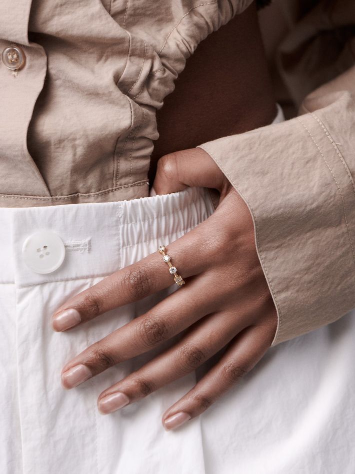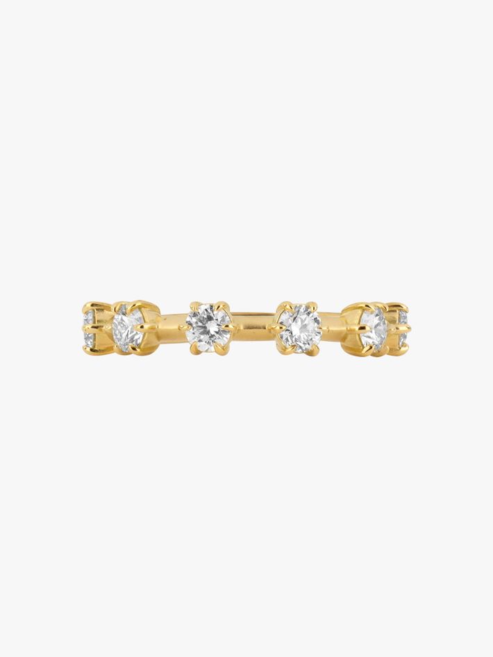 ten brilliant, round diamonds set in Jade's signature Kismet style, all the way round the band