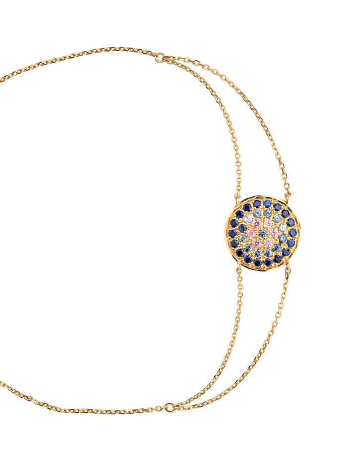 Eighteen navy blue sapphires, twelve light blue sapphires, six pink sapphires. The clasp is accented by one marquise cut blue sapphire.
