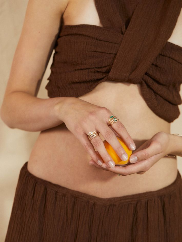 A classic trio of sparkling diamonds on a pave band, this piece can be a solo statement piece or a lovely pairing with another band.