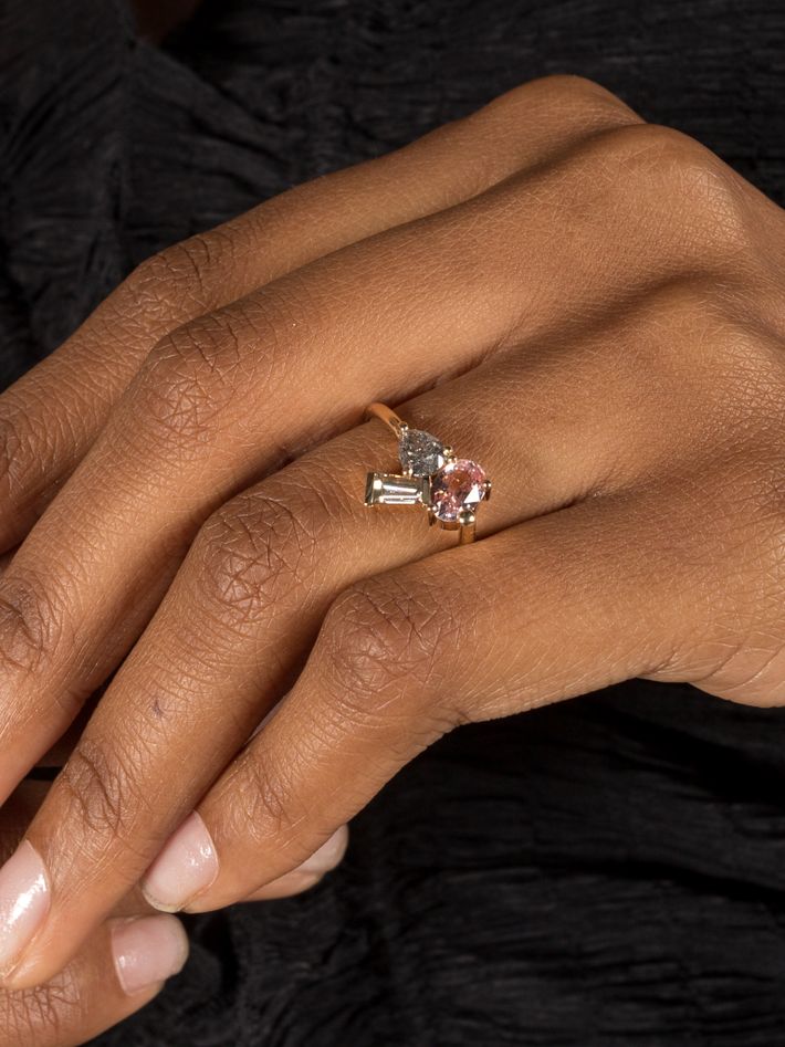 Only one piece made18 kt solid rose gold1.08 ct in 1 sapphire, 0.52 ct in 1 diamond & 0.29 ct in 1 brown diamond