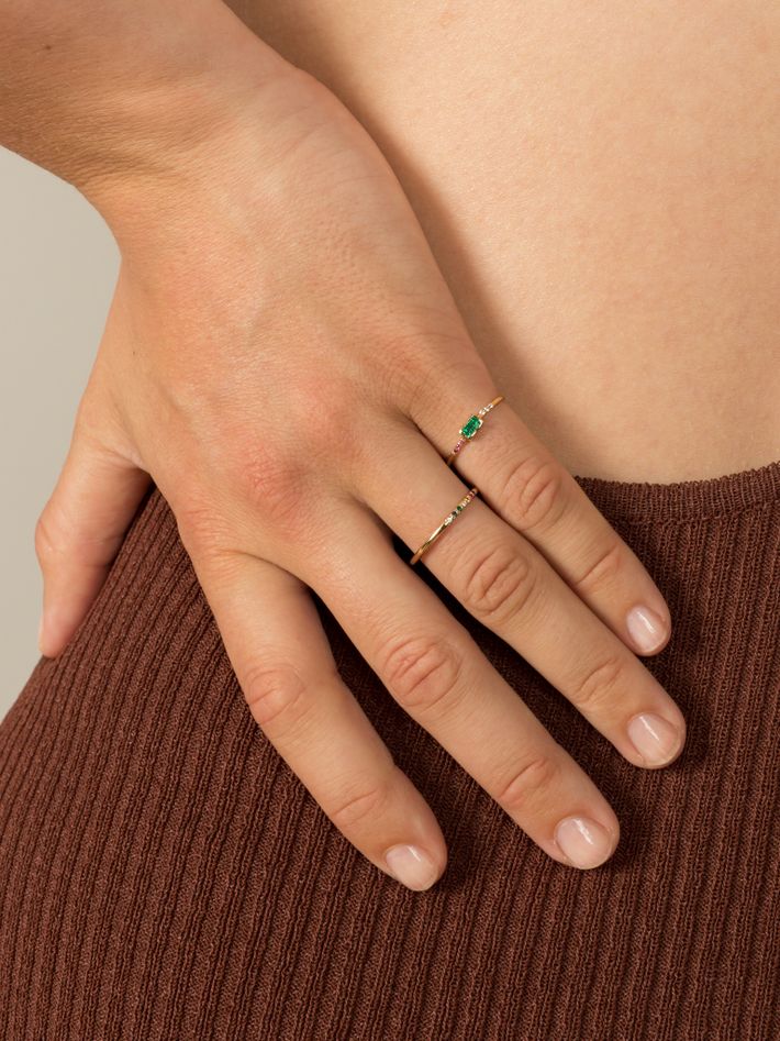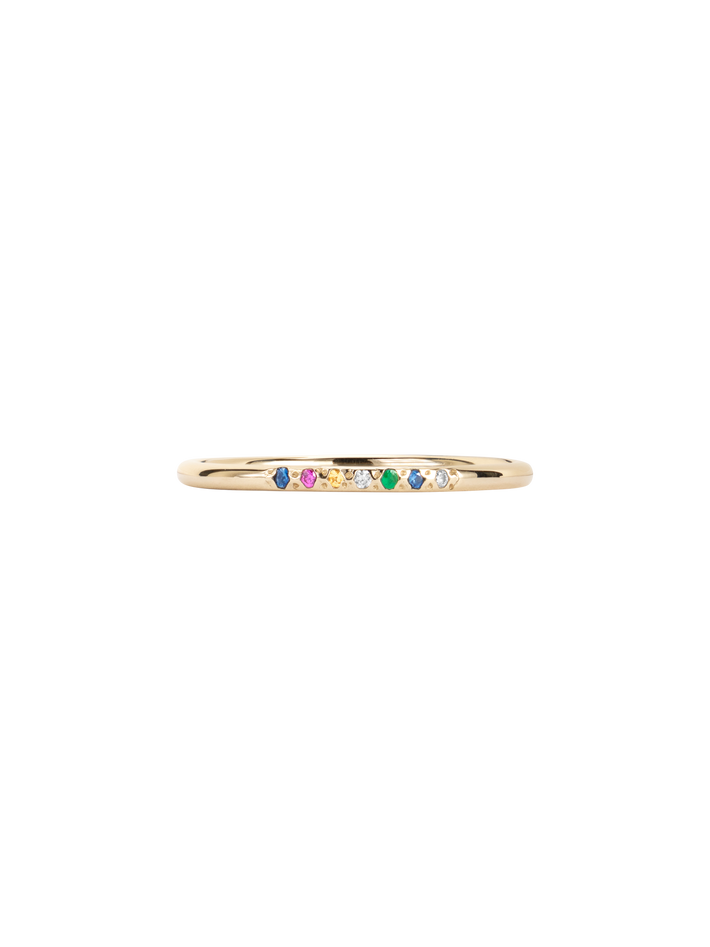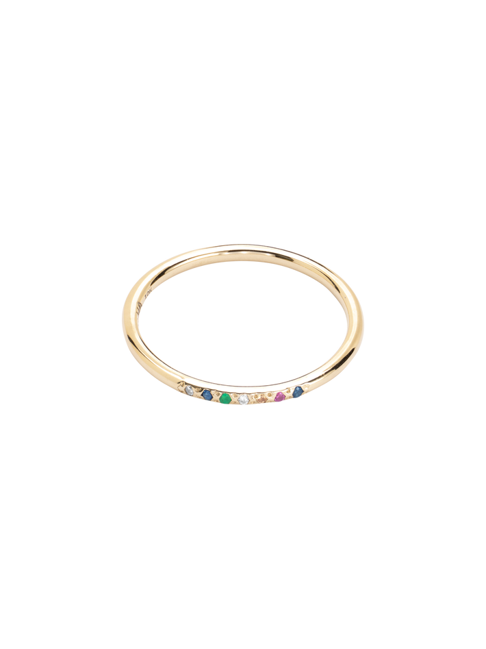 A beautiful delicate ring set with rainbow gemstones, this piece looks lovely stacked with other rings from Scosha's collection.
