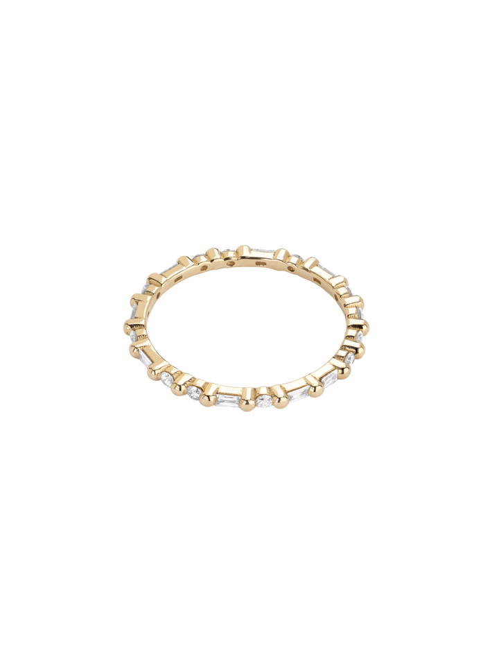This piece makes a unique wedding band alternative with its randomly spaced round and baguette diamonds.