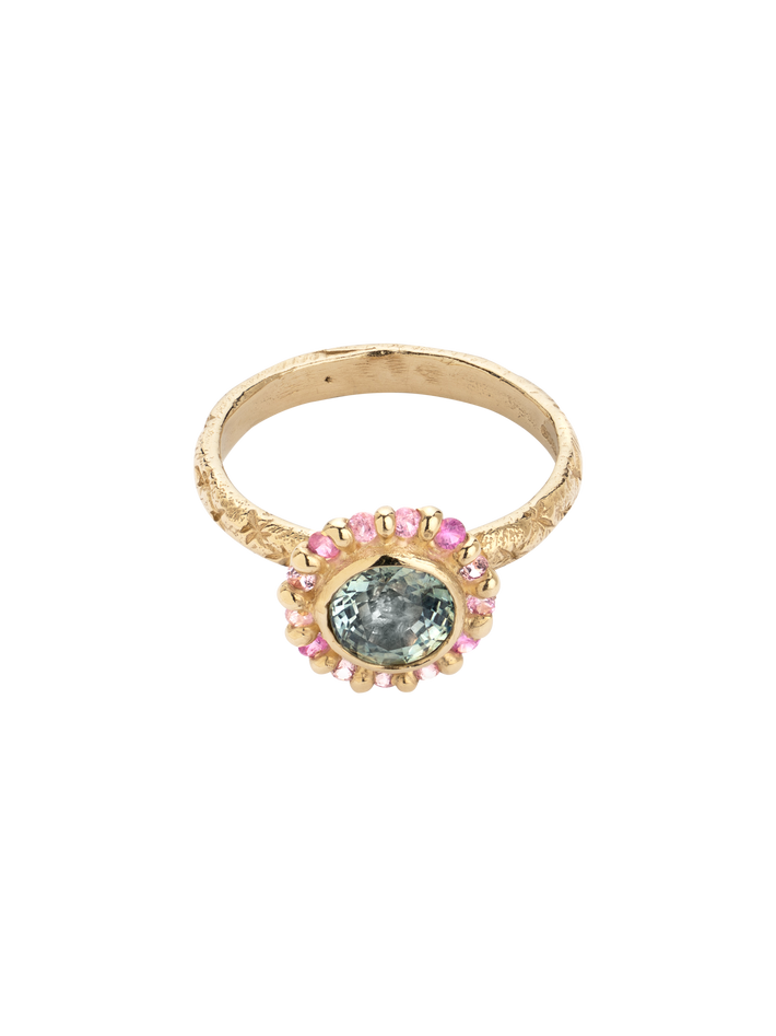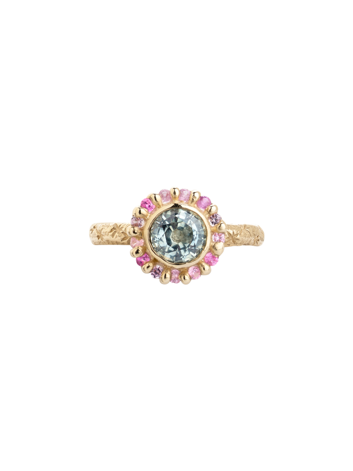Reclaimed Montana Green Sapphire & Pink Sapphire Halo. Due to the nature of how we source our stones, the colour may vary slightly.