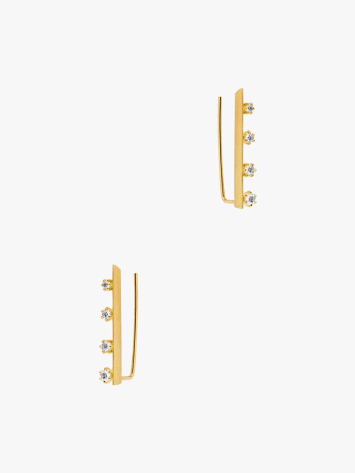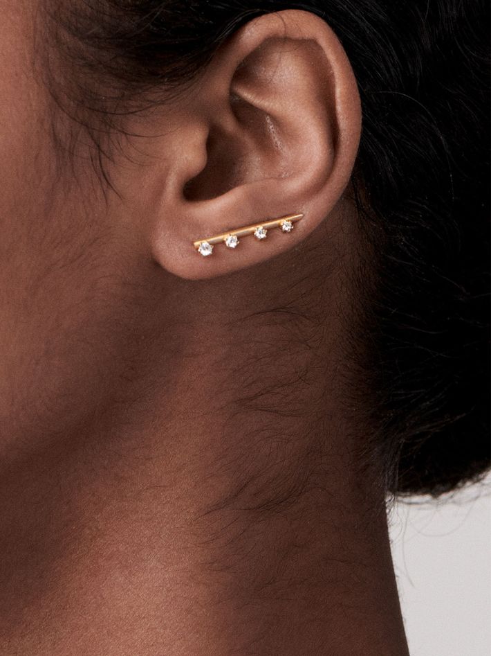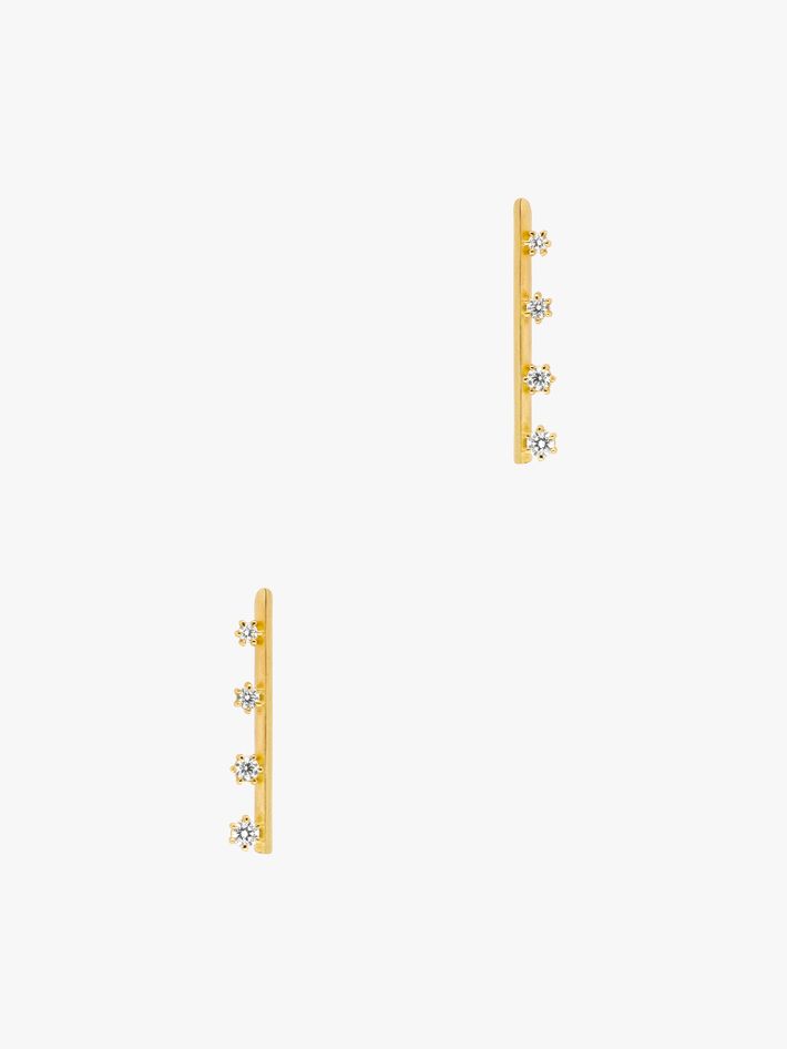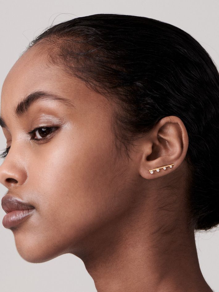 four round brilliant-cut diamonds hanging off a bar in Jade's signature Kismet style