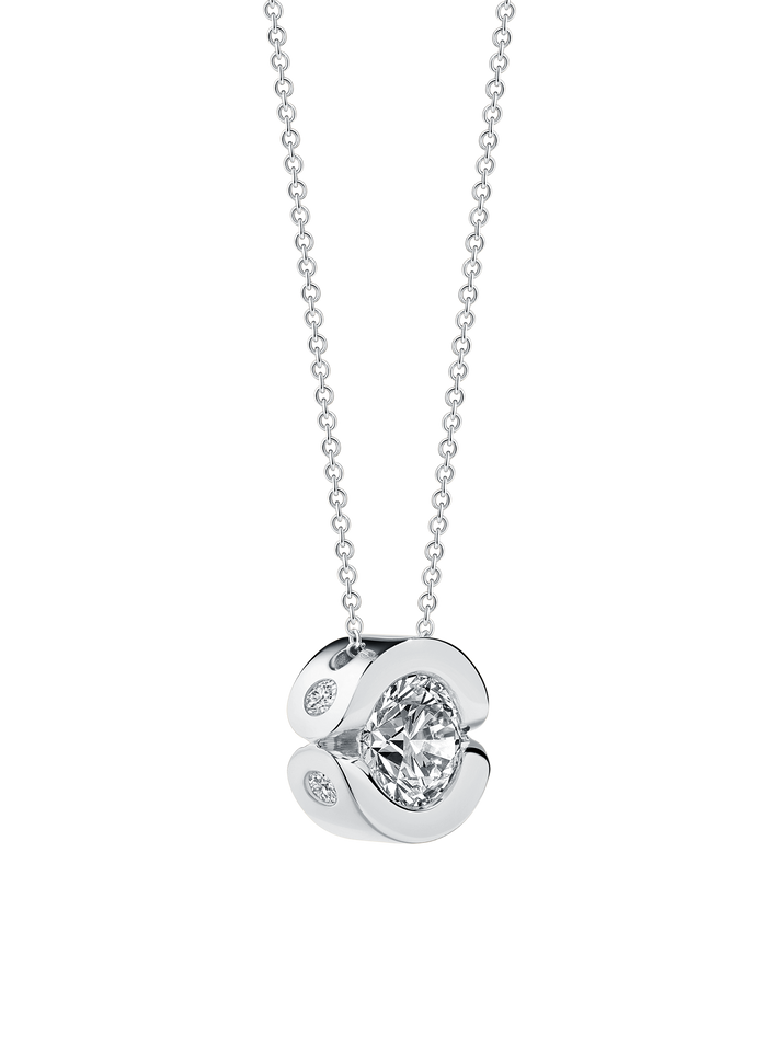 The Hinged Pendant is available in two sizes. Pictured here is The Hinged Large Pendant. The Hinged Small Pendant is handmade from certified 18K recycled white gold, each pendant features a total of 1.72 carats of VVS cultured diamonds including a central 1.53 carat brilliant cut diamond, VVS2 color E. The Hinged Large Pendant is handmade from certified 18K recycled white gold, each pendant features a total of 2.30 carats of VVS cultured diamonds including a central 2.03 carat brilliant cut diamond, VVS2 color E. Please note that the carat weight may vary slightly from piece to piece. All pendants featuring solitaire diamonds with a carat weight above 1.0 will come with an IGI certificate of authenticity.