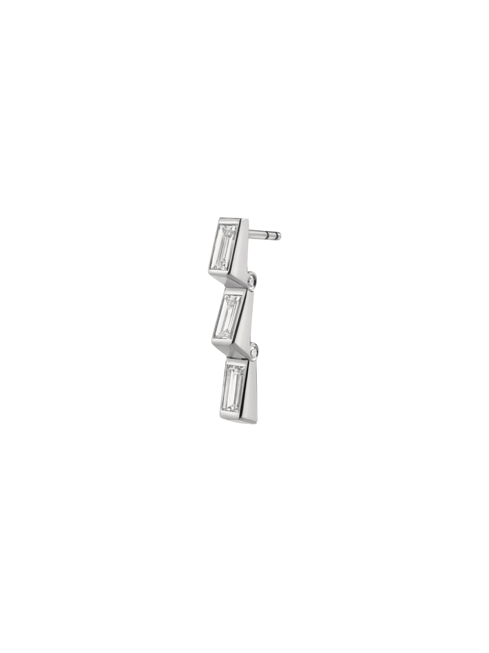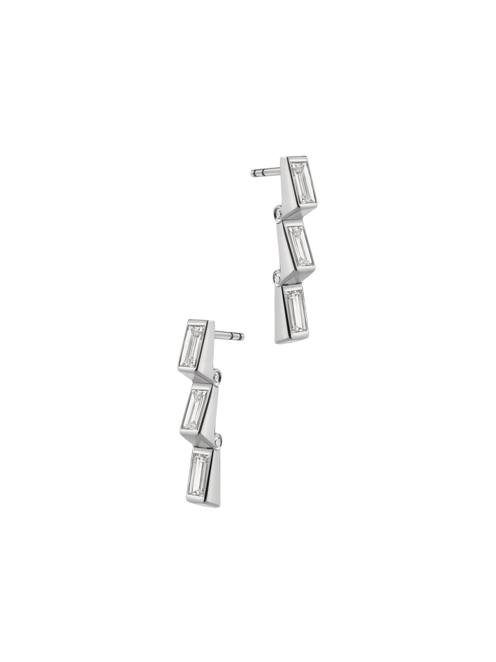 Adorned with a total of 1.29 carats of cultured VVS diamonds per earring, including 3 baguette-cut diamonds at 0.41 carats each.