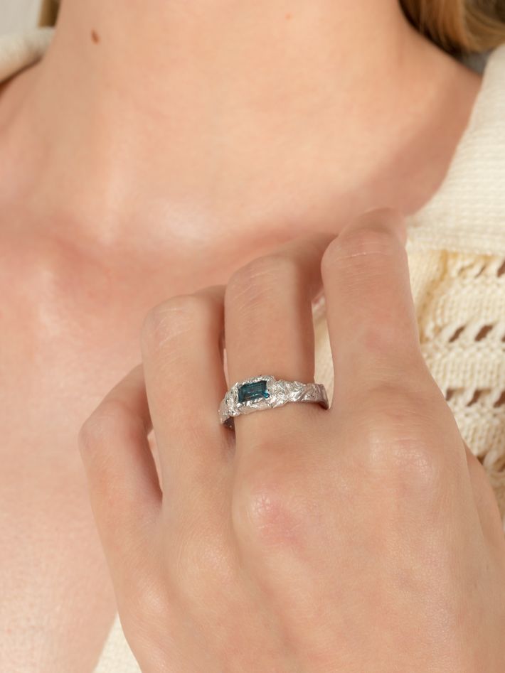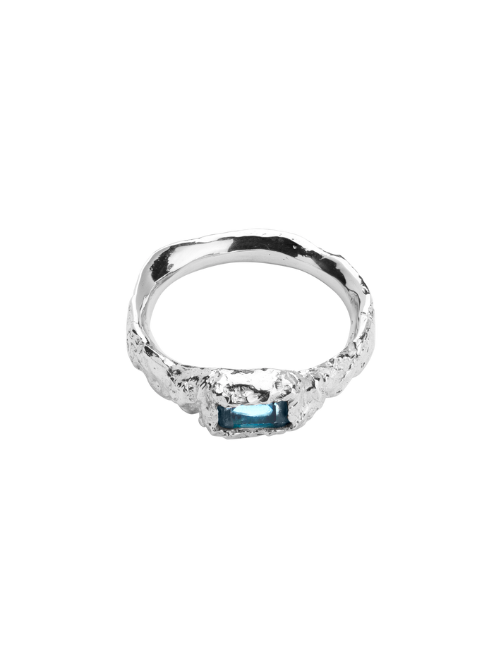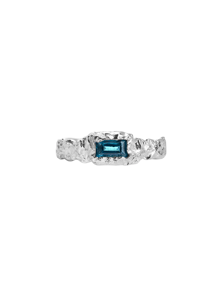 This molten ring is set with a sparkling blue topaz and adds an elegant, unique touch to any look.