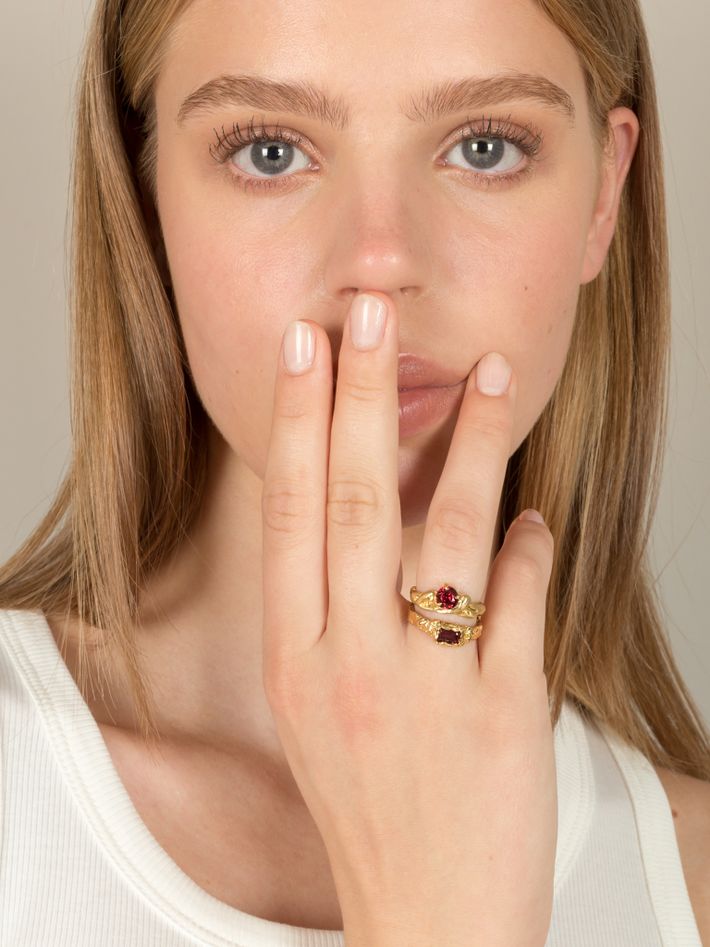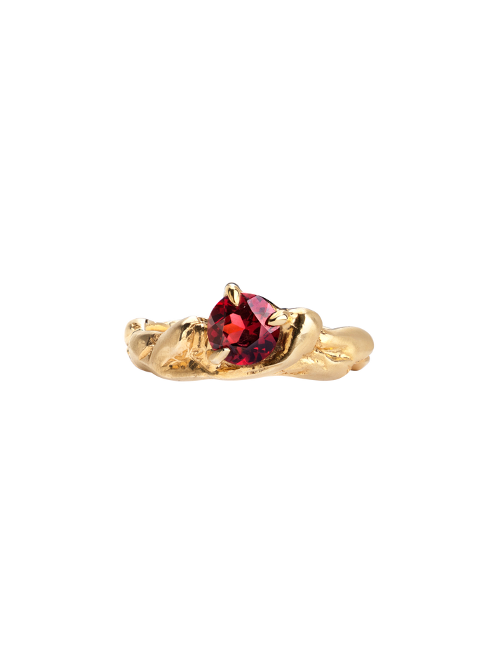 This molten ring is set with a sparkling garnet and adds an elegant, unique touch to any look.