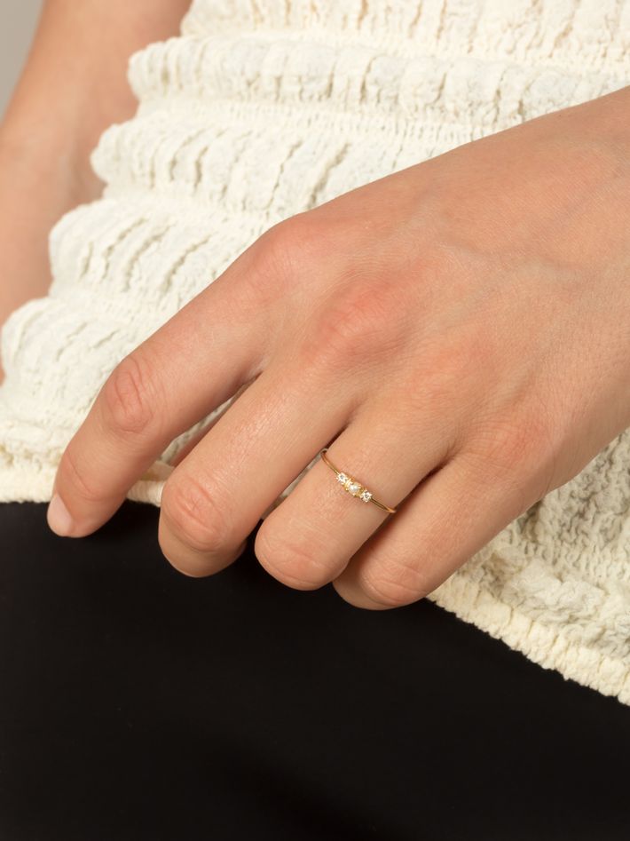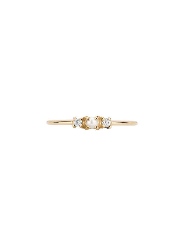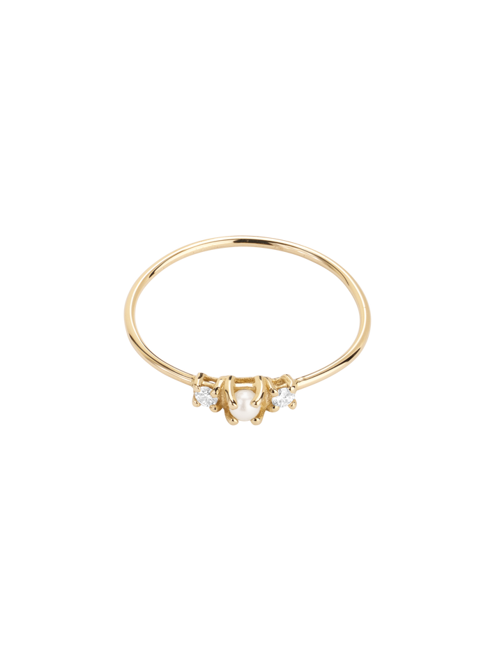 A centred pearl with two tiny set diamonds adorns this hand pulled wired band. A beautifully delicate piece.