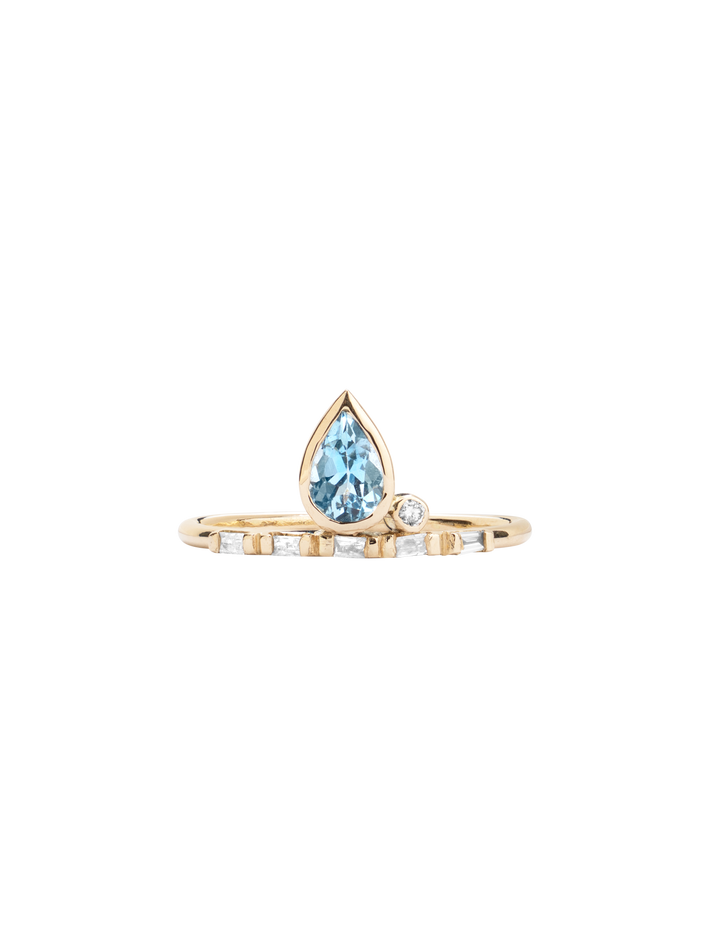 A piece set with aquamarine and finished with a thin gold band with baguette diamonds, this would look lovely stacked with other rings.