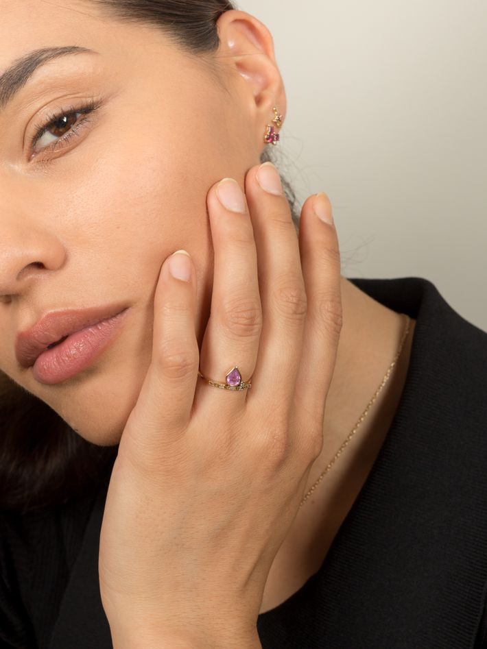 A piece set with pink sapphire and finished with a thin gold band with baguette diamonds, this would look lovely stacked with other rings.