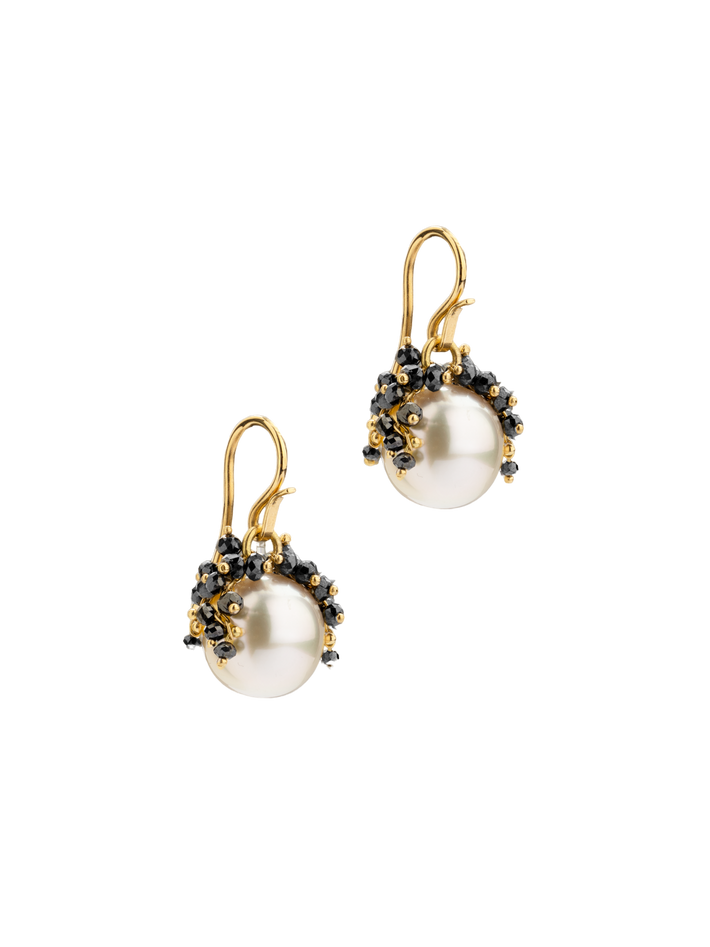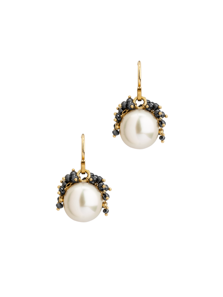 56 black diamond beads surrounding the South Sea pearls, 28 diamonds on each earring.
