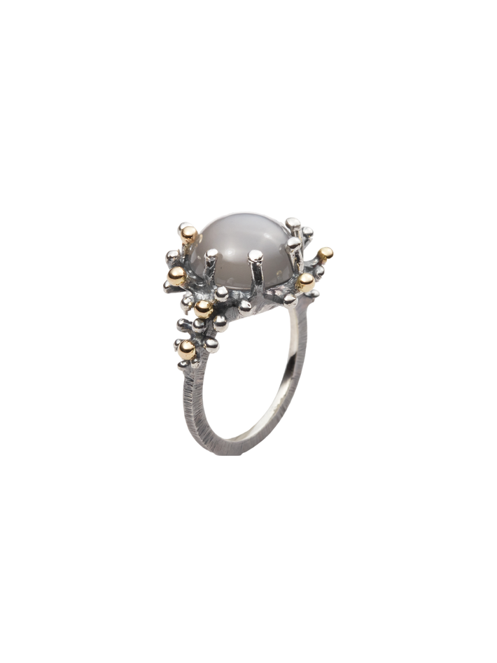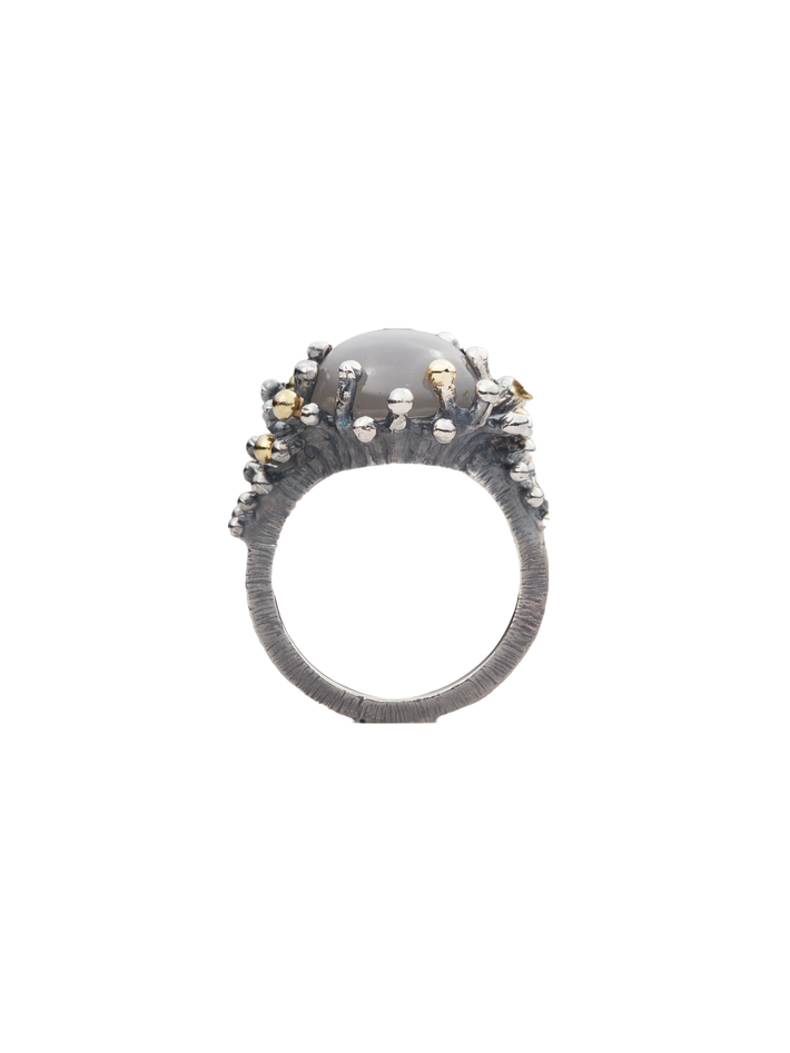 Sea anemone ring in oxidized silver and 18k yellow gold with gray moonstone