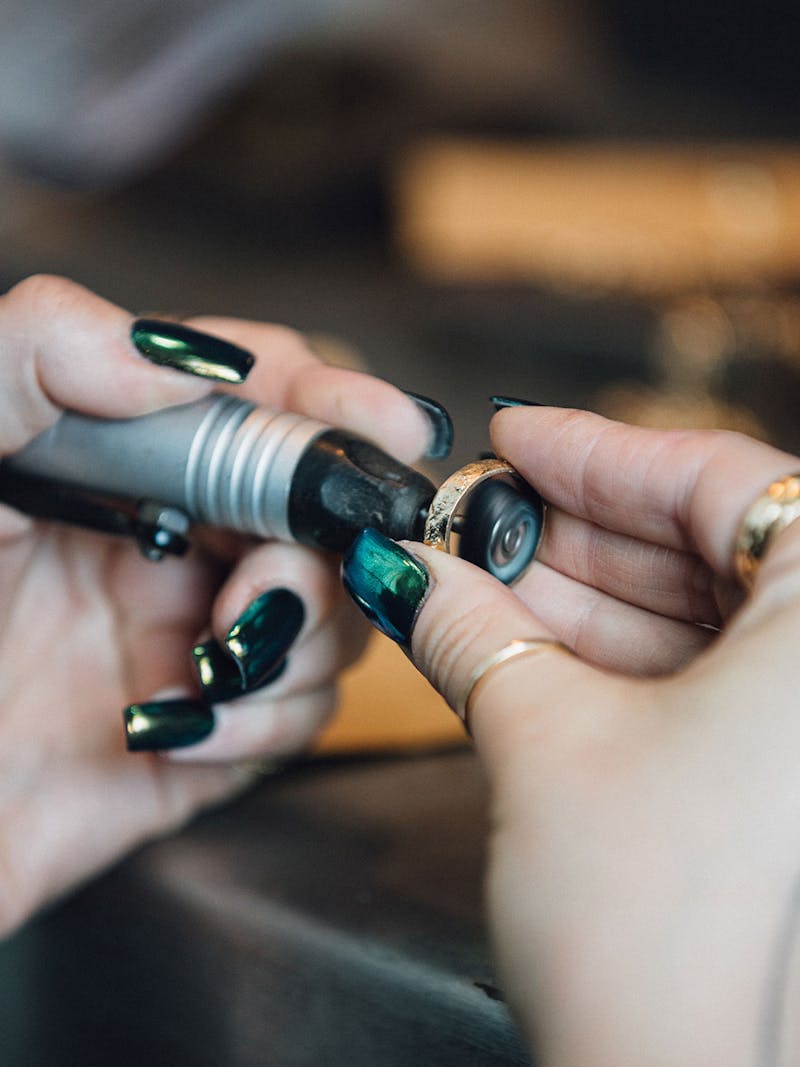 This process has quite a few stages which each require different waxes, wheels and sometimes cleaning in between. An experienced polisher will know what degree of polish each part of the item required as well as knowing which areas may be vulnerable to heavy polishing or certain cleaning techniques. As with the fabrication process, fine jewellery that features lots of gemstones or diamonds will take much longer to finish in order to ensure every bit of metal in between the stones is polished and cleaned to perfection.