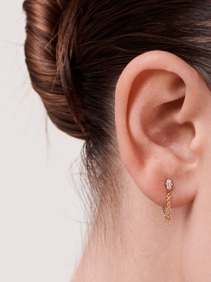 18k gold prong set white diamond baguette stud with 14k gold chain connecting to the earring back