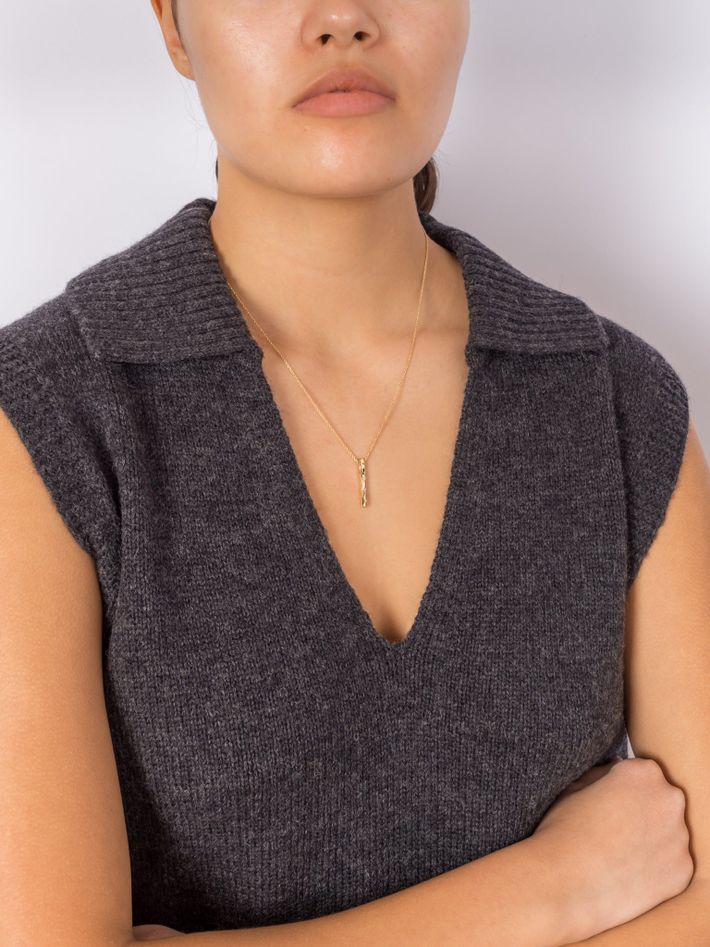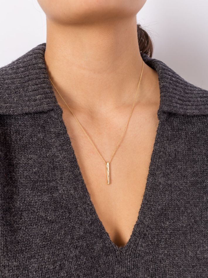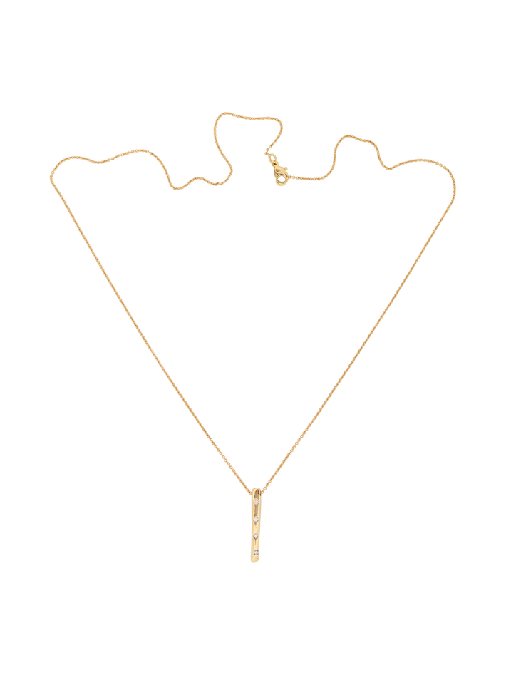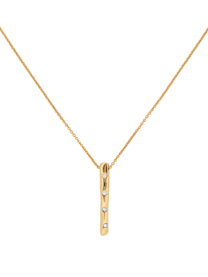 4 round white diamonds set flush in the 2.3cm long bar pendant.