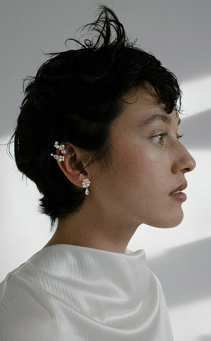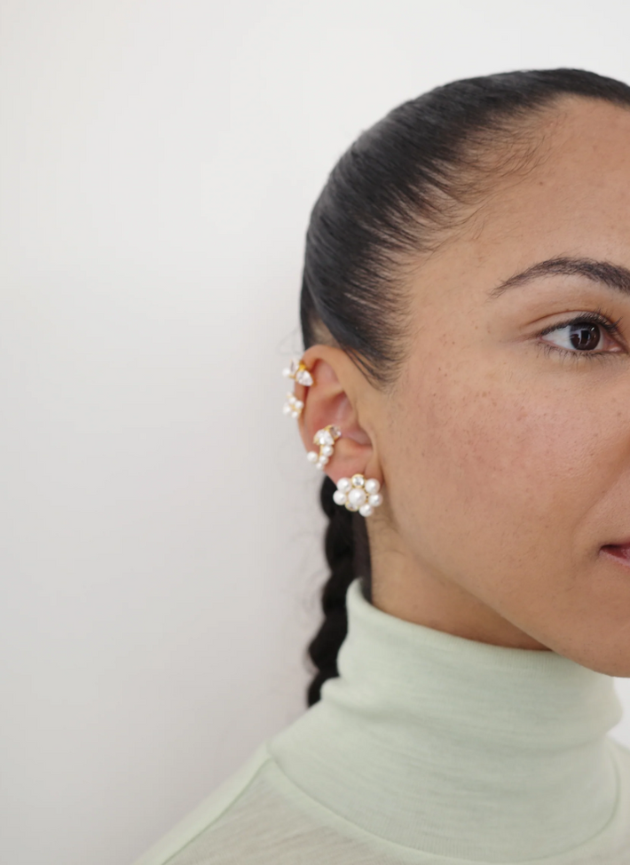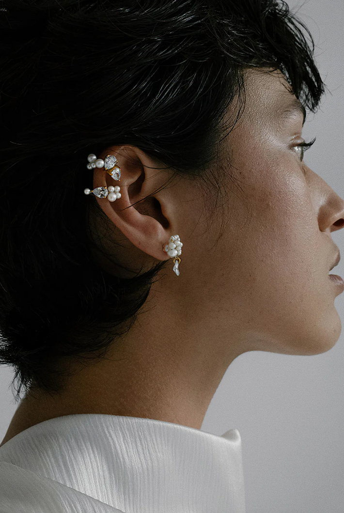 A strand of gold vermeil set with cubic zirconia and white freshwater pearls wrap around the ear