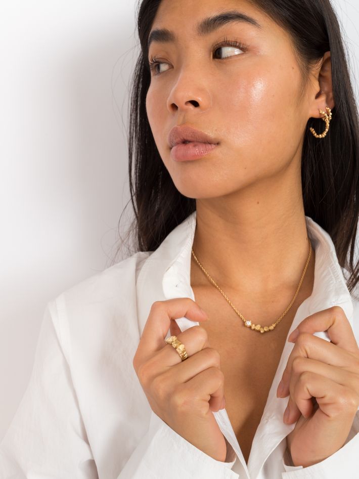 Pernille uses recycled gold and conflict free diamonds in her work. She is inspired by organic forms, such as molten gold and there is a refined element to her work which comes through her handcrafted and attention to detail led way of working.