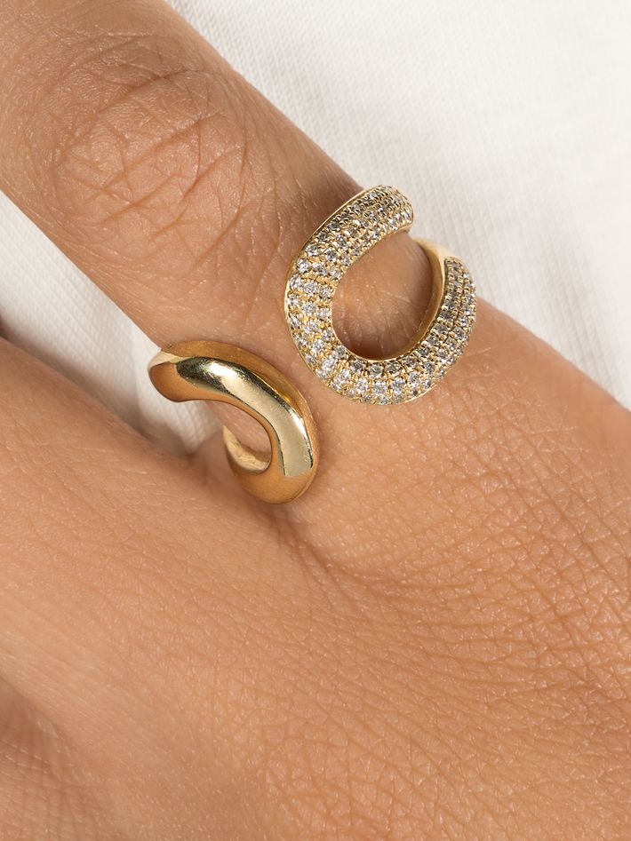 Double beam ring with one side white pavé diamonds