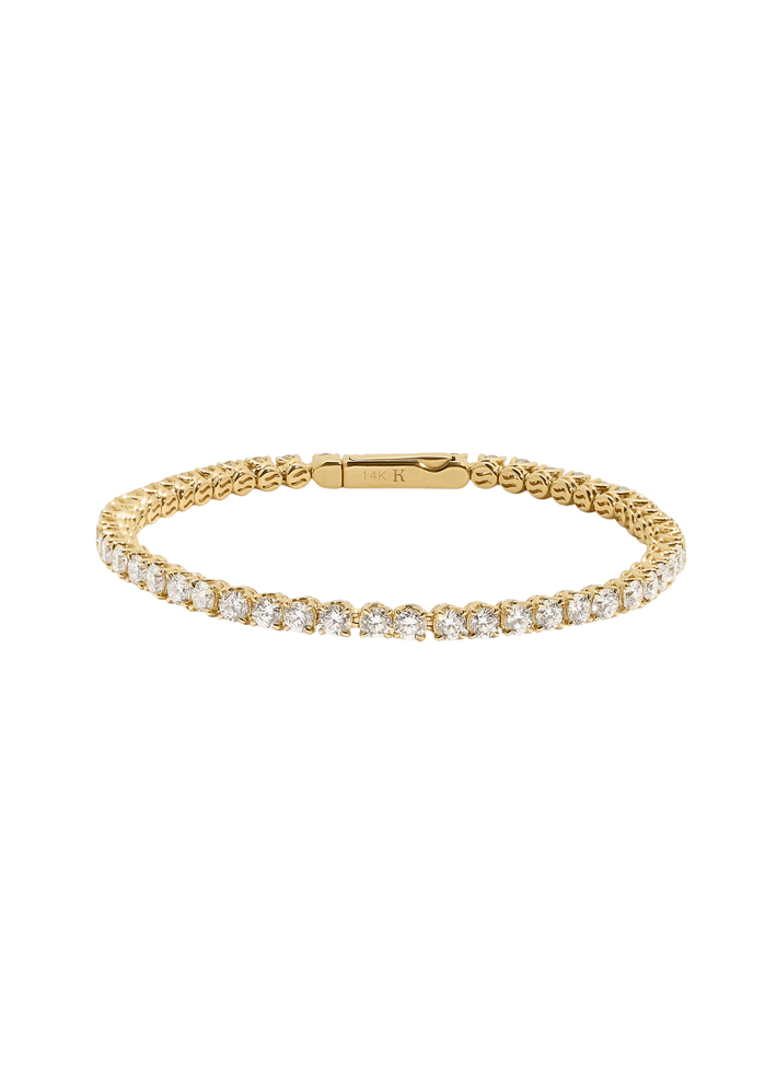 14k solid gold—always Lab diamonds Width: 3mm Thickness: 3.75mm Invisible box clasp with safety Diamond 4 C's: 5ctw, Round, VS2, F Average weight: 9.2g 6: 4.60ctw 6.5: 5ctw 7: 5.30ctw