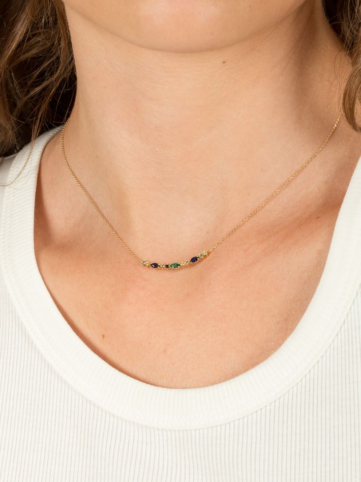 A central marquise cut emerald, two round emeralds, and clasp is trimmed with one bezel set emerald.