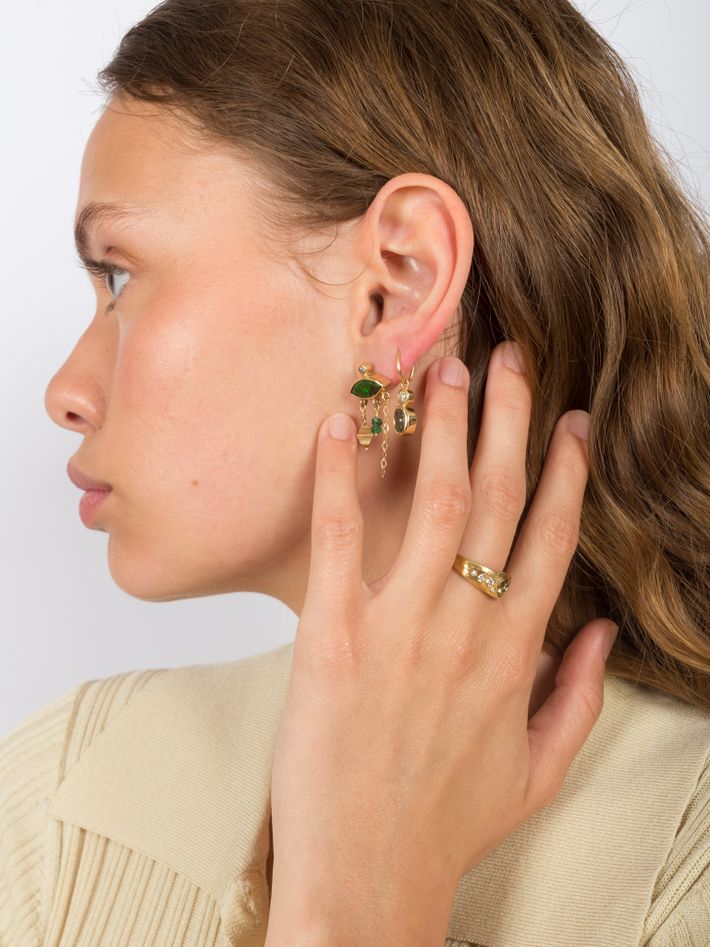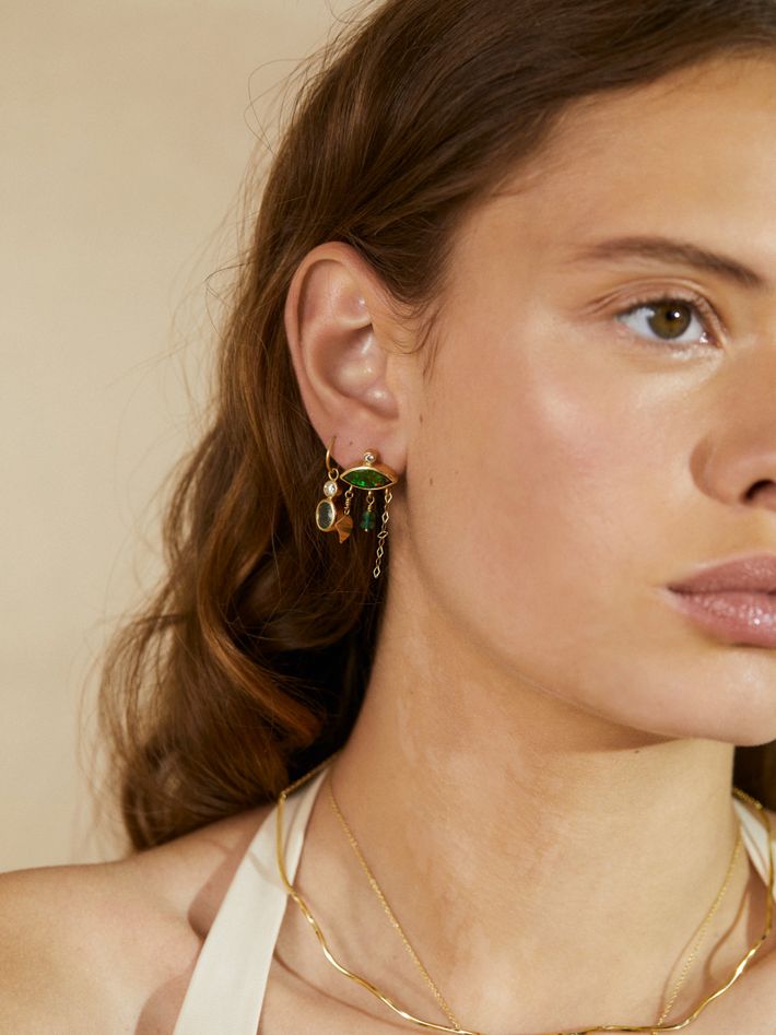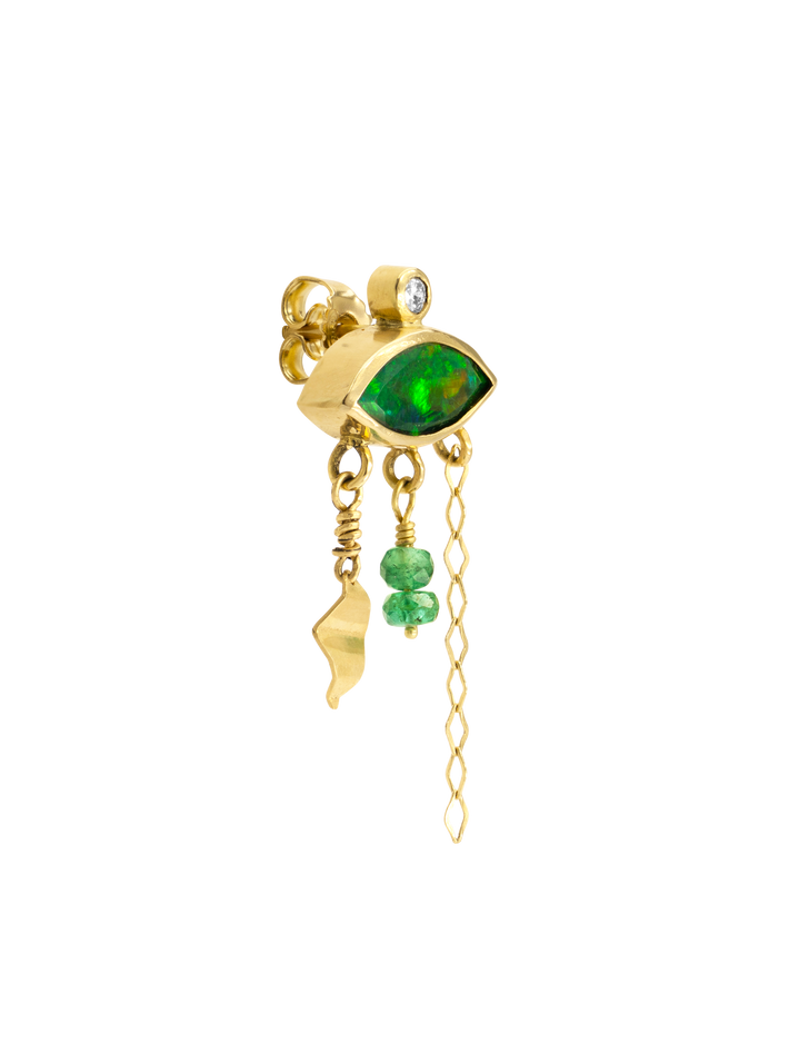 Only one piece made18 kt solid yellow gold1 opal, 0.06 ct in 1 diamond & 2 emeraldsSingle earring