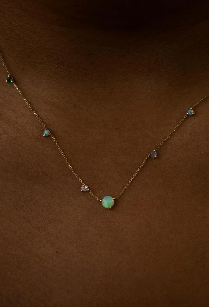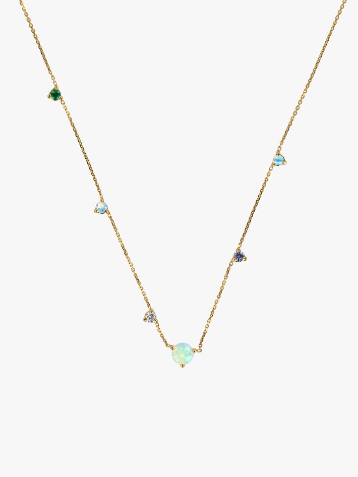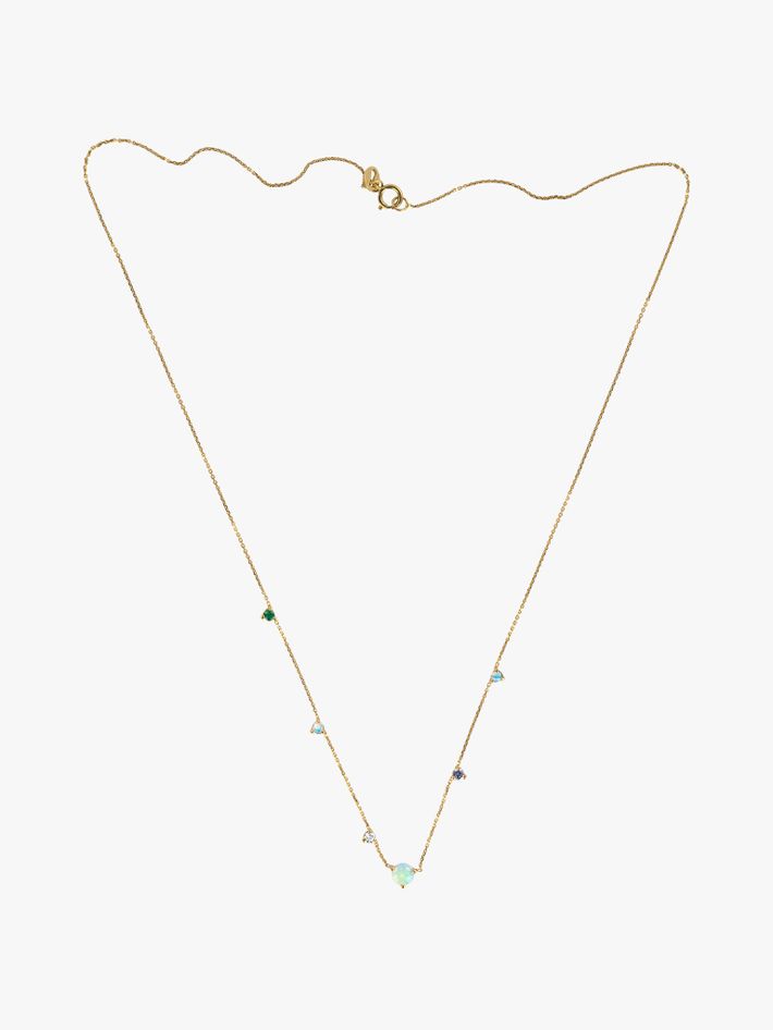 Opals, sapphires, emeralds and white diamonds, set asymmetrically on a gold chain, is an outstanding example of WWAKE's modern simplicity.