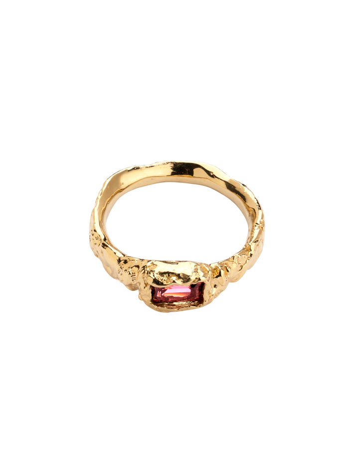 This molten signet ring is set with a sparkling garnet and adds an elegant, unique touch to any look.
