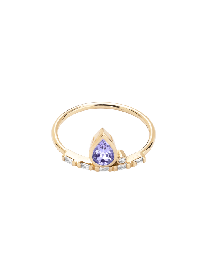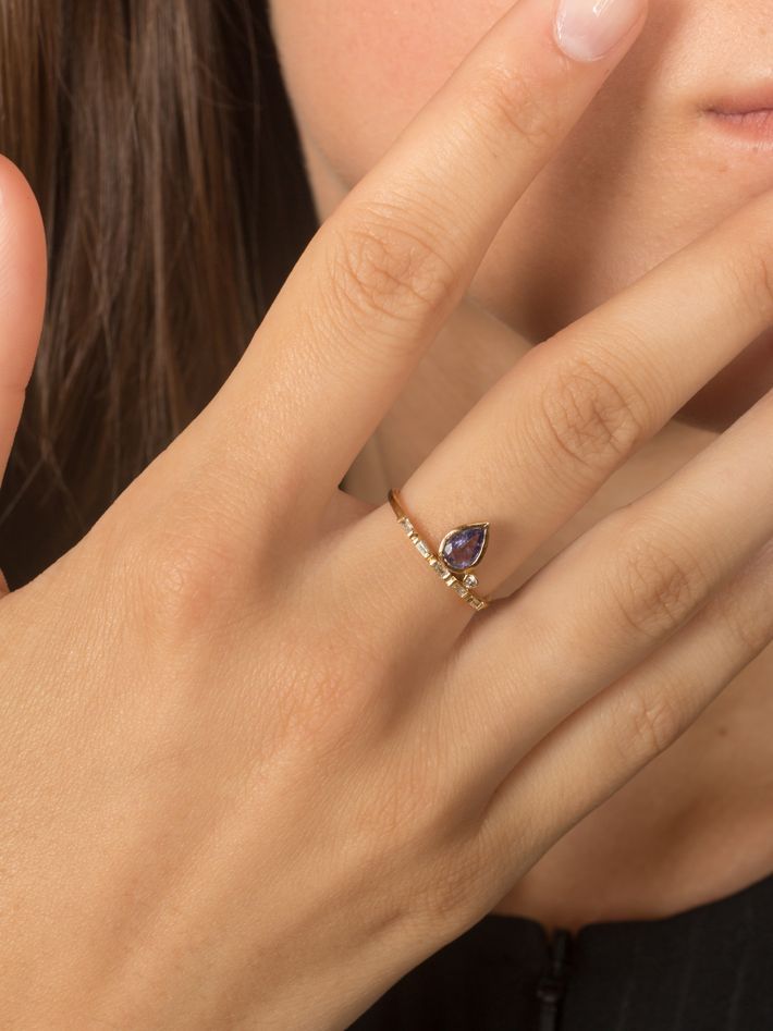 A piece set with violet sapphire and finished with a thin gold band with baguette diamonds, this would look lovely stacked with other rings.