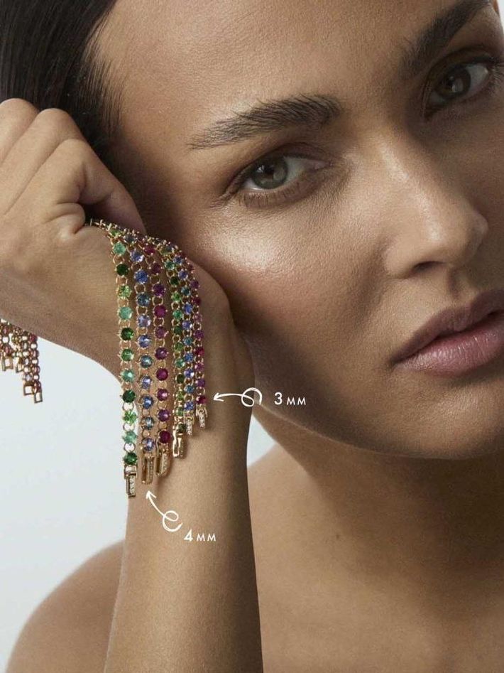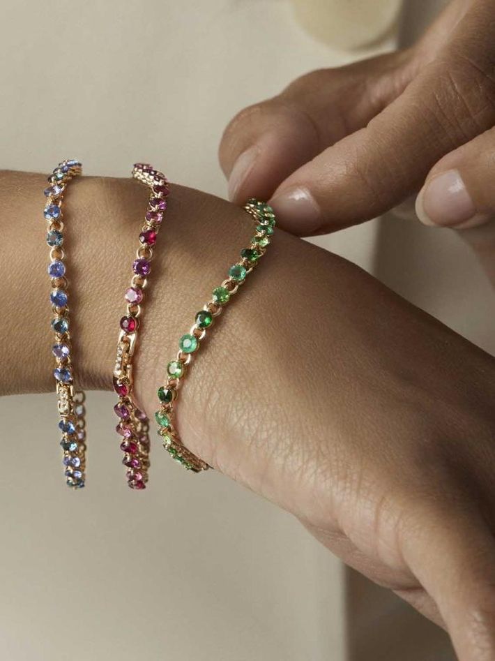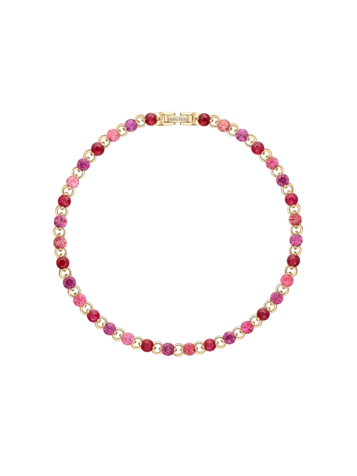 14 kt solid yellow gold1.46 ct in 12 rubies, 1.76 ct in 11 rhodolites, 1.21 ct in 11 tourmalines & 0.01 ct in 3 diamonds