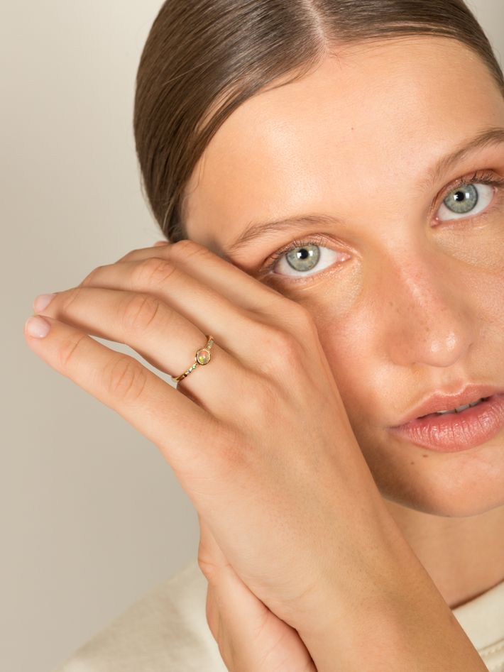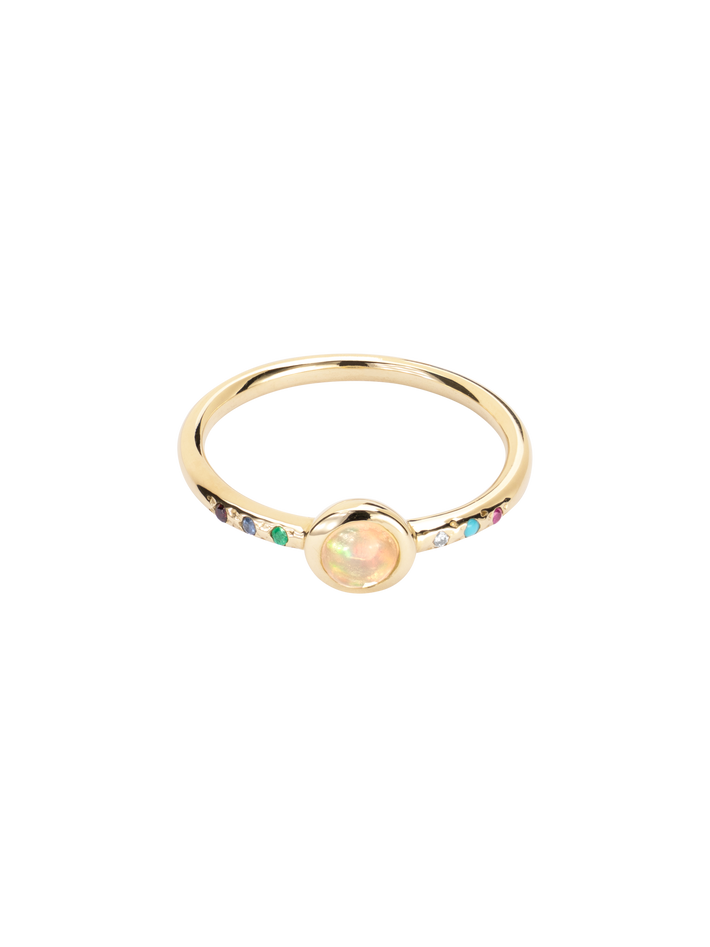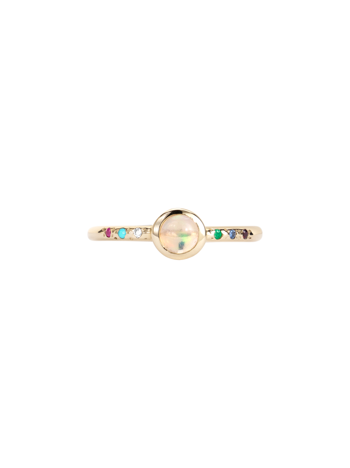 A beautiful delicate ring set with opal and tiny gemstones, this piece looks lovely stacked or on its own.