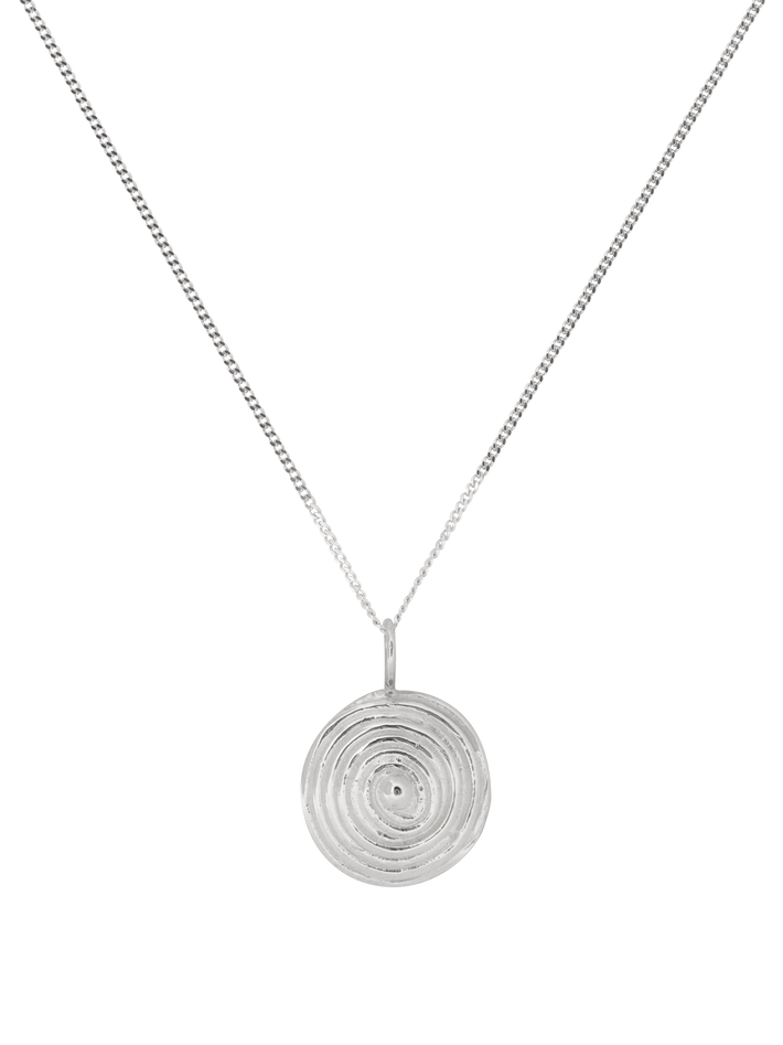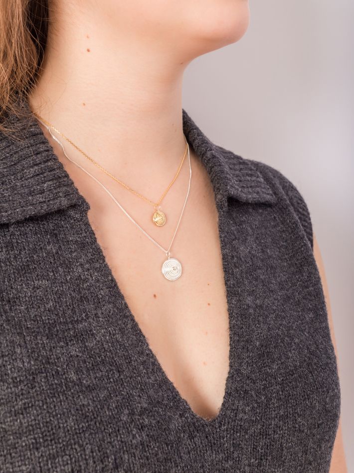 This textured coin symbolises energy and the feeling of new days - it is a great piece to wear by itself.