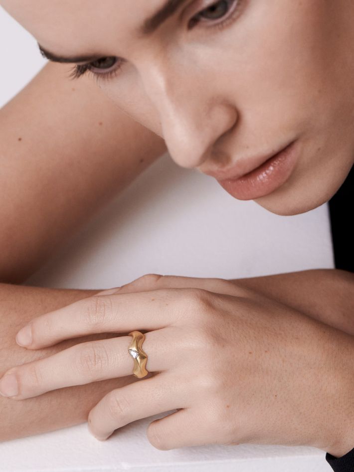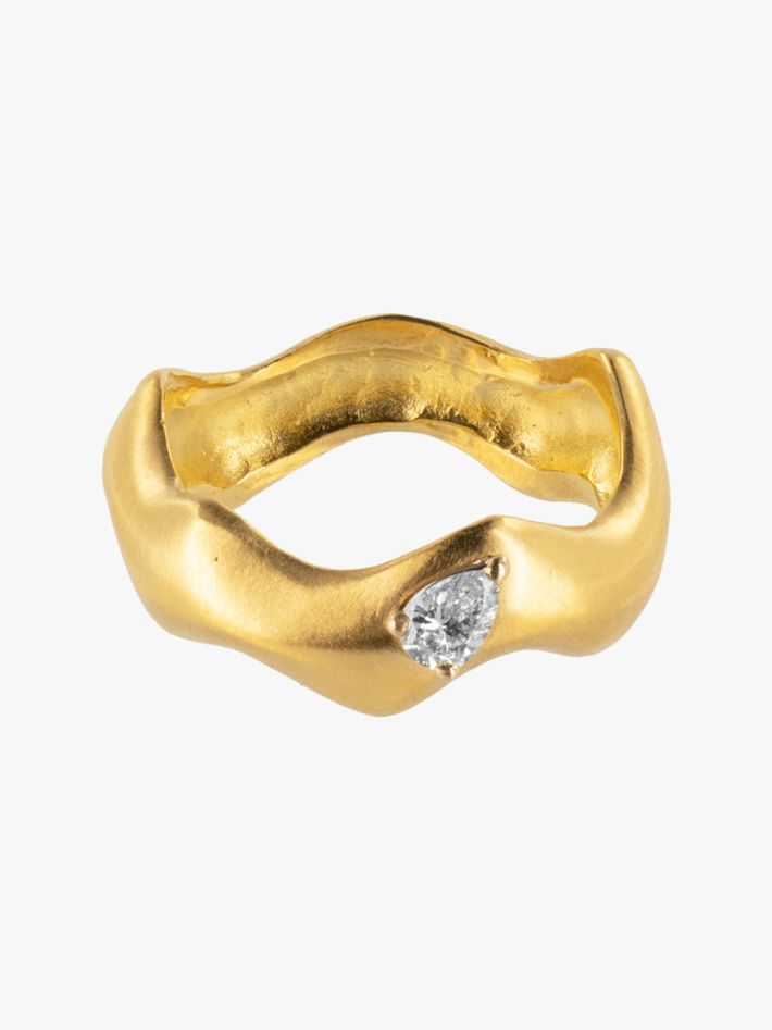 Curving gold ring with pear diamond