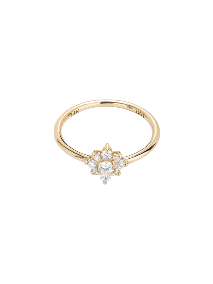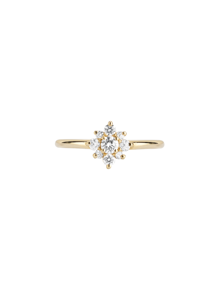 One central 3mm round diamond, surrounded by four 2mm and four 1.5mm diamonds.