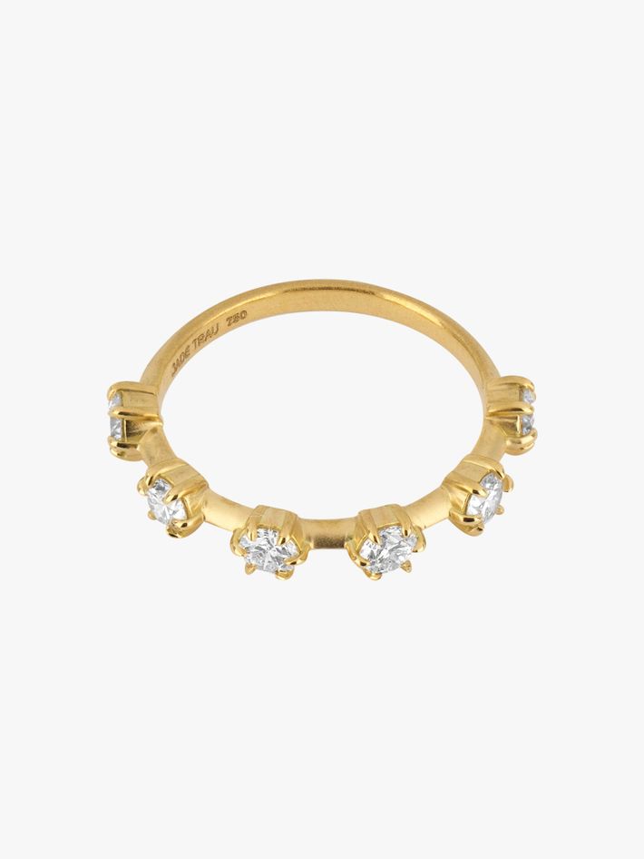 six brilliant, round diamonds set in Jade's signature Kismet style, half way round the band