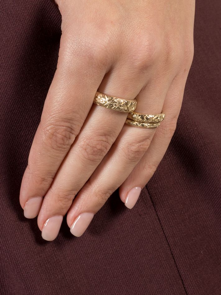Made of a single, solid precious metal or metal alloy. Highly durable, can always be re-polished to regain its shine after wear.