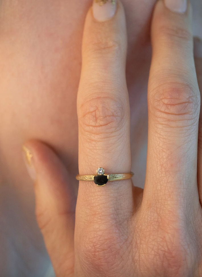 hand-cut jet with a reclaimed antique diamond