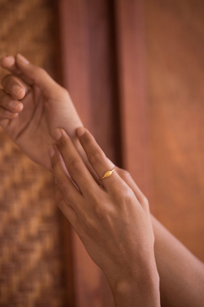 91.6% gold content, a warmer beeswax-yellow hue. An exclusive and malleable precious metal which will shape slightly to the wearer over time. 22kt gold is hypoallergenic and generally safe for people with sensitive skin.