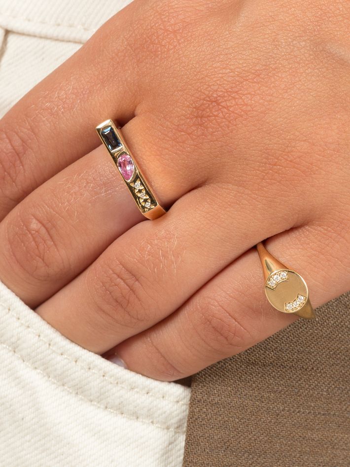 One pear shaped pink sapphire, one baguette shaped blue sapphire