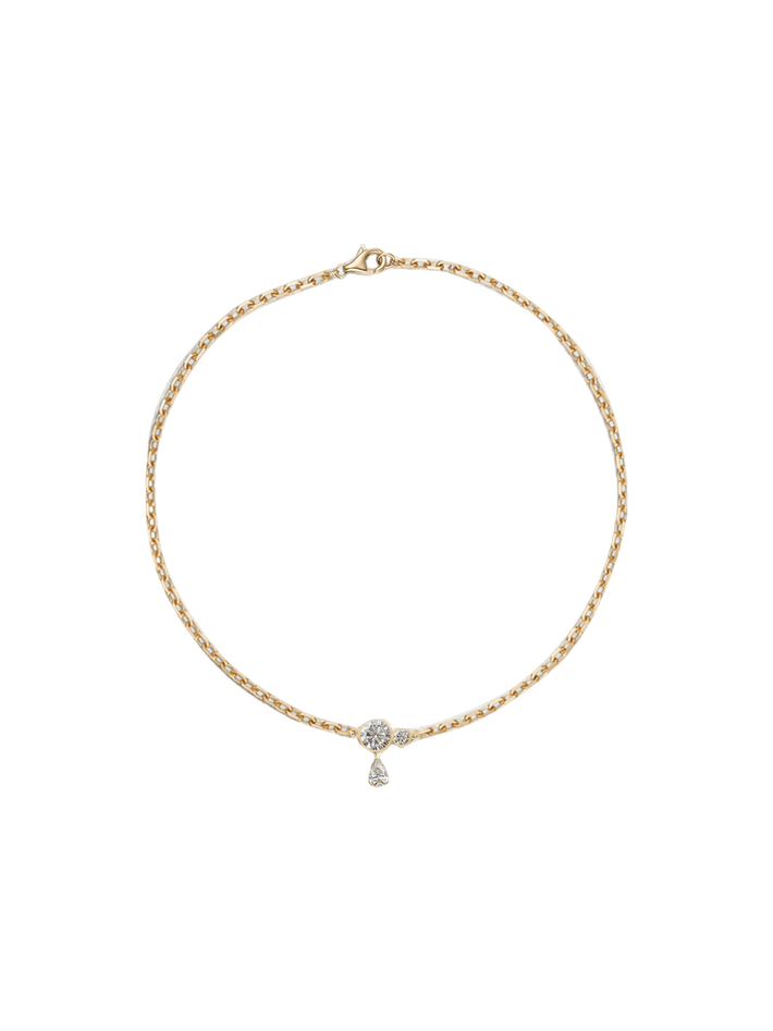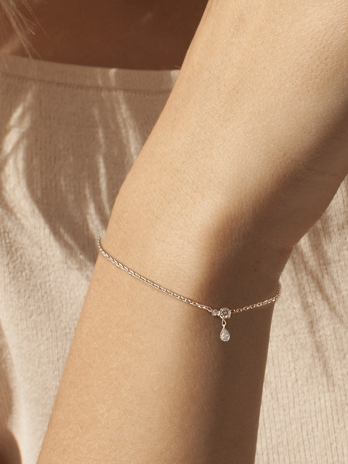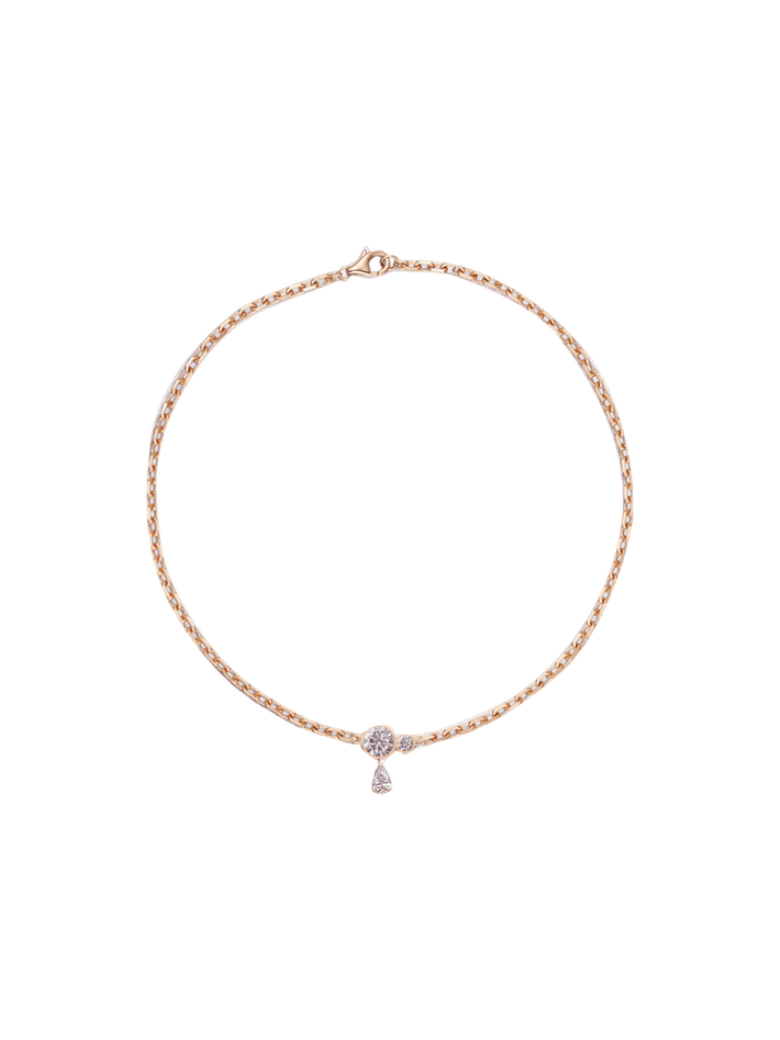 A sparkling pear diamond that dangles from two nestled diamonds. Diamond Grade: F/G colour, VS clarity.