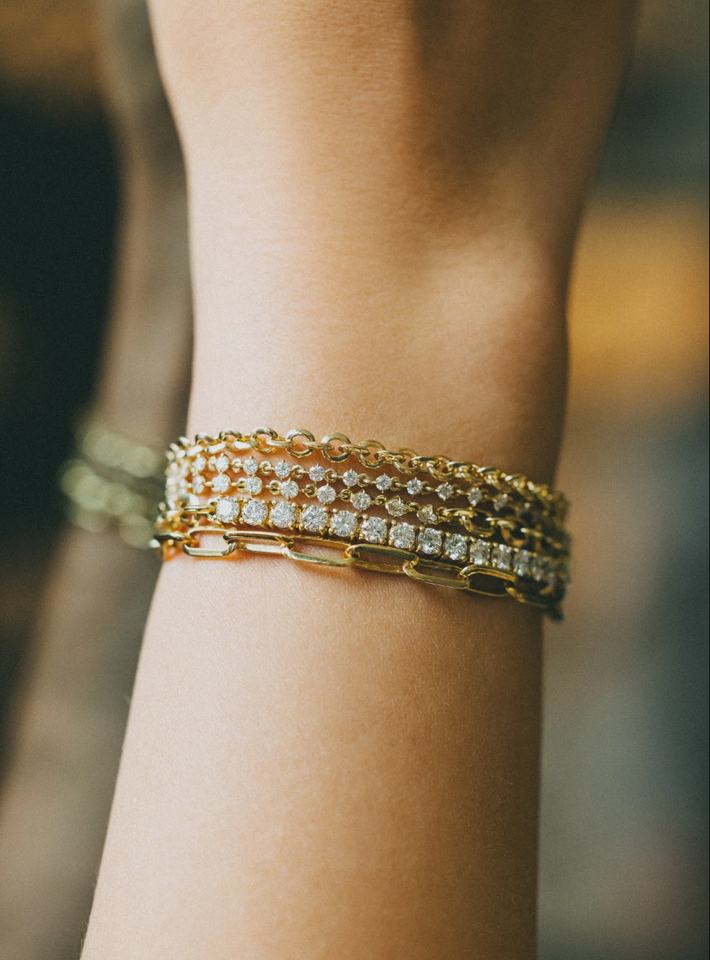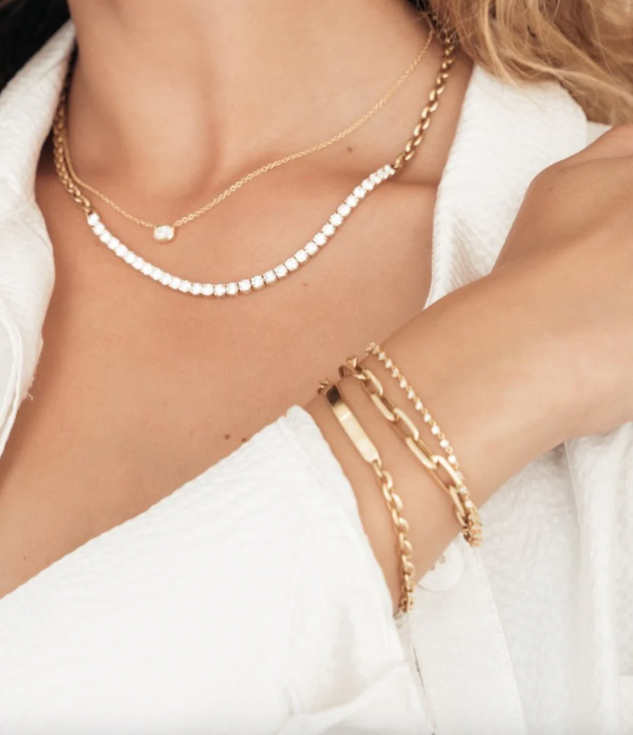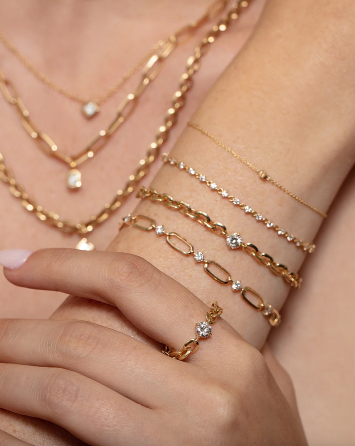Lizzie’s minimal jewellery has a strong impact. Choose from fine chains with floating gemstones or something a little more bold. Her pieces are designed to be layered and can also be personalised.